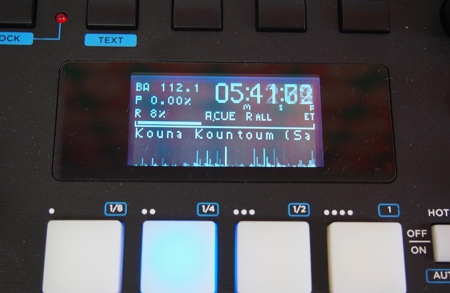 Display -> Wenn man von einer Software kommt, ist man einiges an Luxus gewohnt. Das betrifft nicht nur das hier fehlende Play-Lock, sondern auch die angebotenen Informationen zu einem Titel. Die gibt es auch beim GMX, nur eben auf zwei LCD-Displays von 55mm x 30mm. Gefühlt ist das ein Rückschritt in Zeiten der ersten CD-Player. Neben den Essentials (Spielzeit, Pitchbereich, Tempo, eventuelle Loops und Cuepunkte) liefert eine kleine Waveform eine Übersicht des Tracks. Der visuallisierte Ausschnitt läßt sich in vier Stufen zwischen 1,7 und 13,6 Sekunden zoomen.