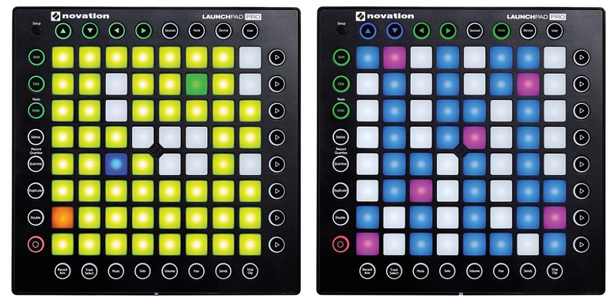 Die Maße des Launchpad Pro sind nach wie vor kompakt. Mit 26x26x3 Zentimeter hat es gegenüber seinem Vorgänger gerade mal 2x2x1 Zentimeter zugelegt. Im Zentrum steht weiterhin eine Matrix von 8x8 Pads, die wie gehabt 19x19mm messen. Allerdings sind diese anschlag- sowie druckdynamisch und geben über eine RGB-Hintergrundbeleuchtung die Farbe des in Ableton geladenen Clips wieder. Die Anzahl der seitlichen Funktionsbuttons hat sich verdoppelt, somit entfällt zum Beispiel das bisher notwendige Umschalten, man gelangt nun direkt zur Mixersteuerung oder zu den Aufnahmefunktionen.