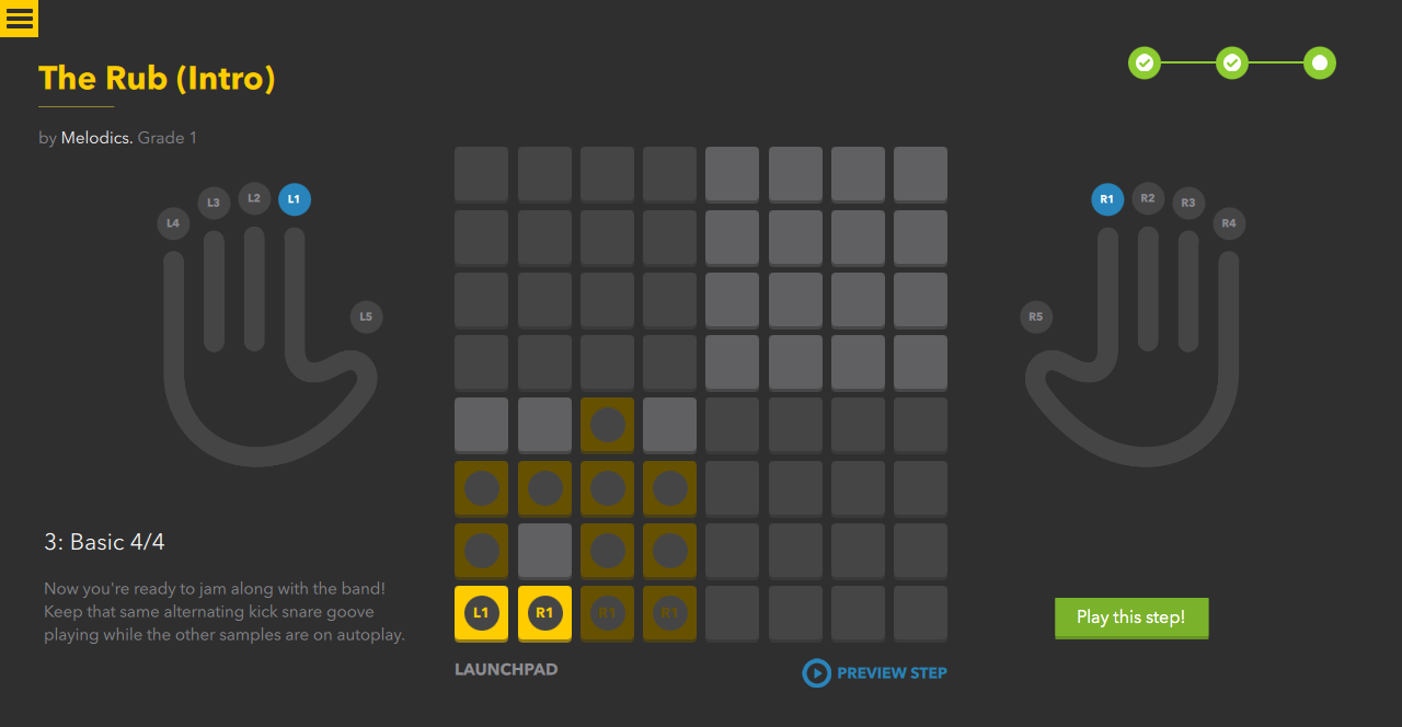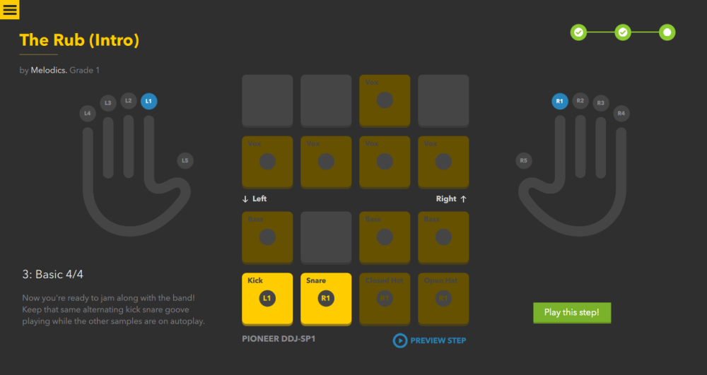 Die ausgewählte Lektion ist grafisch vorbildlich umgesetzt. Abgebildet ist der angeschlossene Controller mit seinen belegten Pads, dazu die rechte und die linke Hand. Die zu nutzenden Finger sind hervorgehoben. Über einen Preview-Button gewinnt man einen Eindruck vom Übungsziel, dann geht es auch schon los.