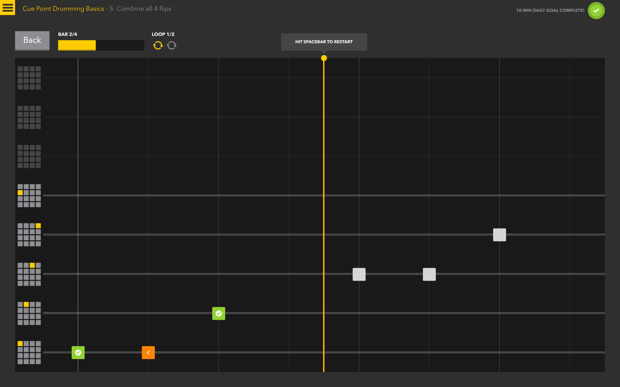 Ein System, welches an Notenlinien erinnert, zeigt die zu spielenden Elemente an und wo am Controller man diese findet. Also zum Beispiel Bassdrum, Snare oder Hi Hat. Wird die Übung gestartet, laufen "die Noten" über eine Markierung, das Zeichen diese anzutriggern.  Wenige Loops Loops lang, ist die Übung so aufgebaut, dass in einzelnen Durchgängen Element für Element dazukommt. Man übt erst mit der Bassdrum, dann mit der Snare, dann in Kombination und am Ende den kompletten Beat.