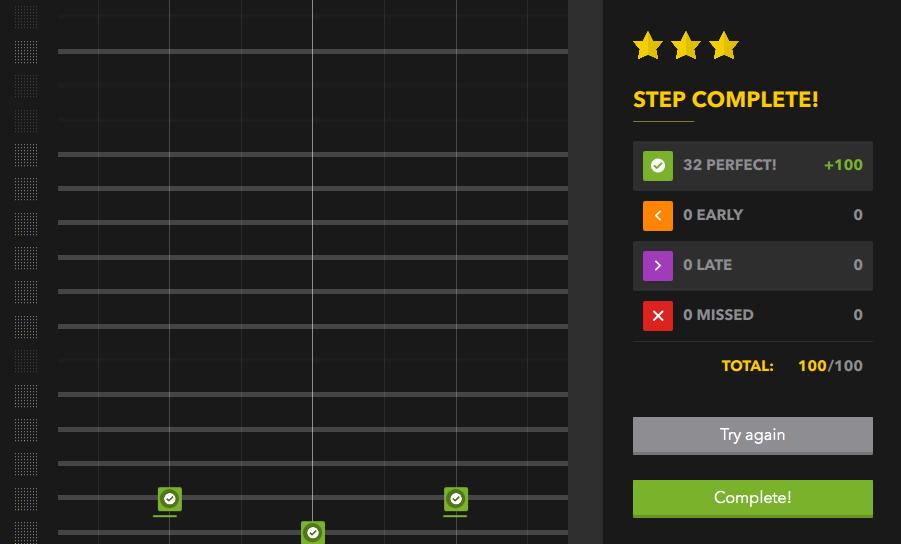 Die Quote an perfekt getroffenen, verpassten oder zu früh bzw. zu spät angetriggerten Elementen wird fein säuberlich aufgelistet. Bis zu einer bestimmten Fehlerfreiheit ist ein Schritt zu wiederholen, erst dann kann er abgeschlossen werden. Für die gesamte Lektion erhält man wiederum Punkte und man gelangt darüber zu weiteren Aufgaben. Klassische Funktionsweise eines Computerspiels.