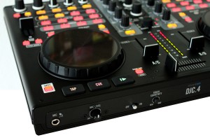 Der DJC.4 bietet eine Menge Features für einen Preis von ca. 370.- Euro. Das schwarze Gehäuse ist auf der Oberseite mit einem Alu-Faceplate versehen und macht einen robusten Eindruck. Die Unterseite ist aus Kunststoff, der das Gerät keinesfalls abwertet. Im Gegenteil, denn hier wurde sogar an eine seitliche Aussparung gedacht, die das seitliche Anheben des Controllers wesentlich erleichtert. Auf den ersten Blick scheint die Bedienoberfläche mit Controle-Möglichkeiten vollgestopft, aber auf den zweiten Blick trotzdem aufgeräumt zu sein. Man hat in der Tat genügend Knopfe und Regler, um mit mehreren Effekten gleichzeitig, mit manuellen und automatischen Loops, Hot Cues und Sampler, zu arbeiten. Keylock, Scratch/Vinyl Modus, Deck Select (AC/BD) und sogar fürs Pitchbending stehen Tasten zur Verfügung. Alle Tasten sind mit einer sehr hellen Hintergrundbeleuchtung ausgestatten. Der Druckpunkt von Hot-Cue und Samplertasten ist sehr direkt und erlaubt auch schnellere Manöver. Die Transportasten sind im Gegensatz zu den anderen Tasten nicht aus Kunststoff, sondern einem schwarzen Gummi, das wertig wirkt. Einige Regler wie z.B. EQ, Browser oder der Effekt Select sind Encoder und beim Draufdrücken eine weitere Funktion anbieten. Im Falle der EQ´s wird z.B. die Kill-Funktion aktiviert. Mit der Shift-Taste erweitert sich der Funktionsumfang des DJC.4 um ein Weiteres, da manche Tasten eine Doppelfunktion beherrbergen. Die Fader des DJC.4 machen einen akzeptablen Eindruck. Sie haben kaum Spiel und besitzen einen Staubschutz. Die Faderkappen liegen ordentlich in den Fingern und lösen sich nicht so einfach.