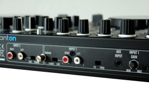 Auf der Vorderseite findet man ebenfalls einen regelbaren Mikrofoneingang, der auch abgeschaltet werden kann. Die Rückseite des DJC.4 überrascht besonders durch die beiden zusätzlichen Stereo Eingänge (Cinch), die wahlweise Phono- oder Line-Signale akzeptieren. Zwar besitzt der DJC.4 keine analoge Mixer-Funktion, aber die Signale können direkt auf den Master oder durch die Software geroutet werden, was so viel bedeutet, dass z.B. auch Plattenspieler- oder CD-Player-Signale in der Software gemixt werden können (Funktioniert nicht in der LE-Version!). Oben drauf gibt es auch noch einen AUX-In als Miniklinke und der Master-Ausgang steht sowohl als Klinken- als auch als Cinch-Verbindung zur Verfügung (Symmetrisch/Unsymmetrisch).