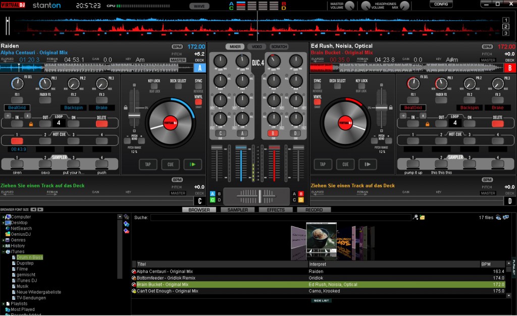 Der Hype um 4-Deck Controller ist bis heute kaum zu erklären. Viele nutzen die zusätzlichen Decks garnicht oder nur selten. Wahrscheinlich ist es eher eine Image-Sache mit einem "Größeren" zum Gig aufzutauchen. Dabei geht bei den meißten 4-Deck Controllern die Anzahl der Bedienelemente klar auf Kosten der Mobilität, denn Größe und Gewicht erweisen sich bei manchem Kandidaten aus der 4-Deck Klasse als ein Hindernis, dass man noch aus Plattencasezeiten kennt. Auch wenn der Markt der 2-Deck Controller recht unübersichtlich wirkt, so gibt es doch Unterschiede in den Details, die sich beim näheren Hinsehen und Ausprobieren erst herausstellen. Stanton erweitert das DJ-Controller Sortiment mit einem sehr kompakten Gerät namens DJC.4 und scheint einen Kompromiss zwischen einer Vielzahl von Bedienelementen und komfortablen Maßen gefunden zu haben. Obwohl mit Virtual DJ LE ausgeliefert erscheint der erste Eindruck der Oberfläche durchaus Traktor Pro freundlich. Wir haben uns den neuen 2-Deck DJ-Controller, der per Umschaltfunktion auch 4-Decks ansteuern kann, mal aus der Nähe angesehen und ihn nicht nur mit Virtual DJ getestet.