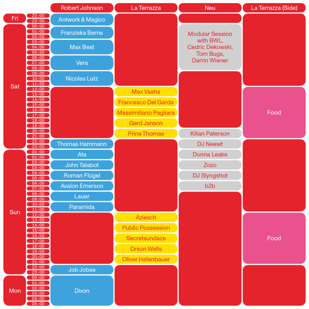 Die 60-stündige Party (wir berichteten) bespielen auf drei verschiedenen Floors dabei hauptsächlich die üblichen Verdächtigen wie Gerd Janson, Dixon, Roman Flügel oder Orson Wells. Tickets für die Party gibt es übrigens nicht im Vorverkauf, sondern nur an der Abendkasse. Der vollständige Timetable sieht wie folgt aus: