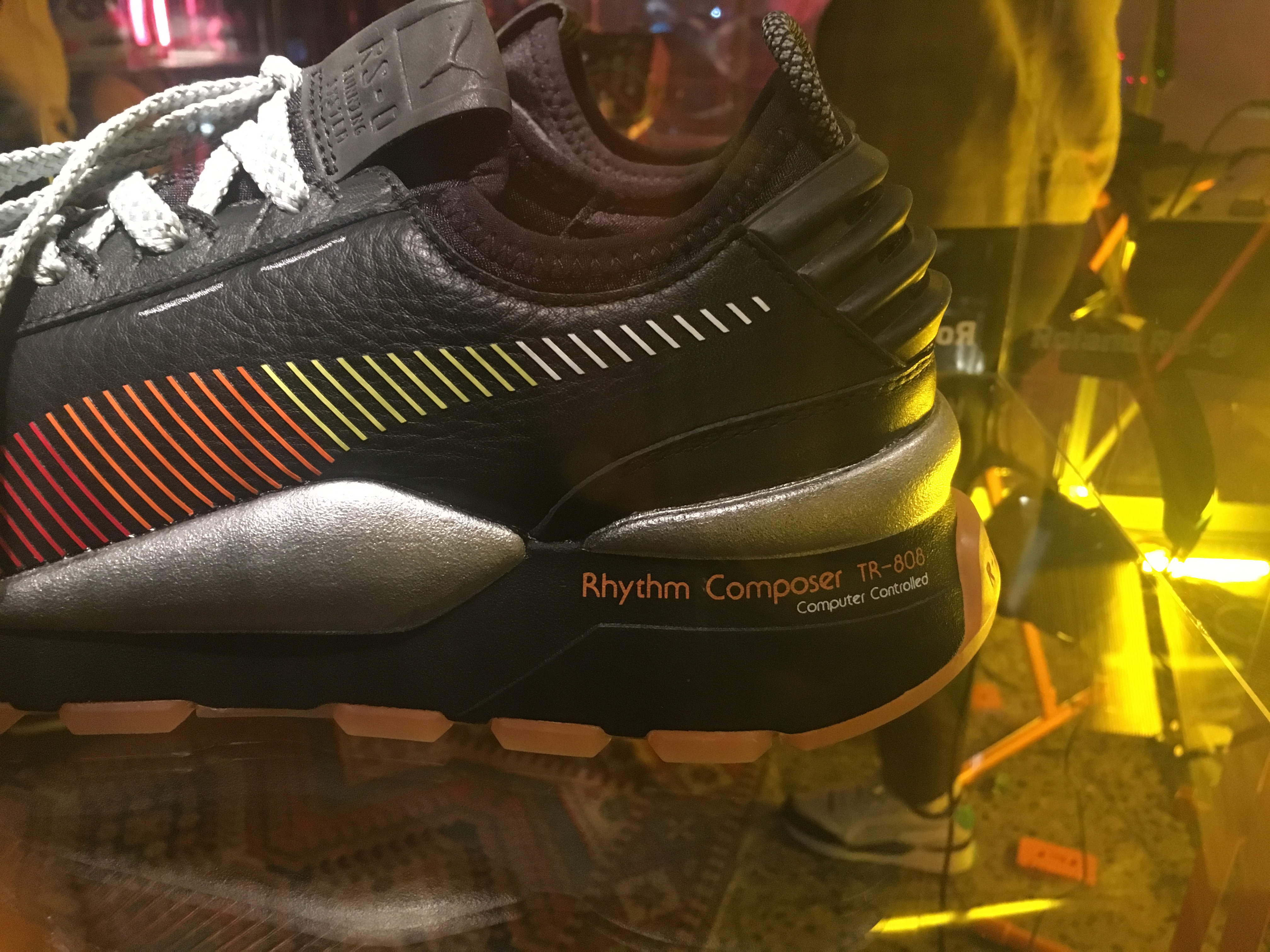 Das markante Design der legendären Drum Machine ist dabei als Ausgangslage in die Kreation des Schuhs mit eingeflossen, der bekannte Farbverlauf des Sequenzers ziert die Seite des Sneakers. Auch die offizielle Bezeichnung "Rhythm Composer TR-808 - Computer Controlled" ist dezent an der Sohle sichtbar, ebenso wie "Bass Drum auf der Innenseite (nicht auf den Fotos).