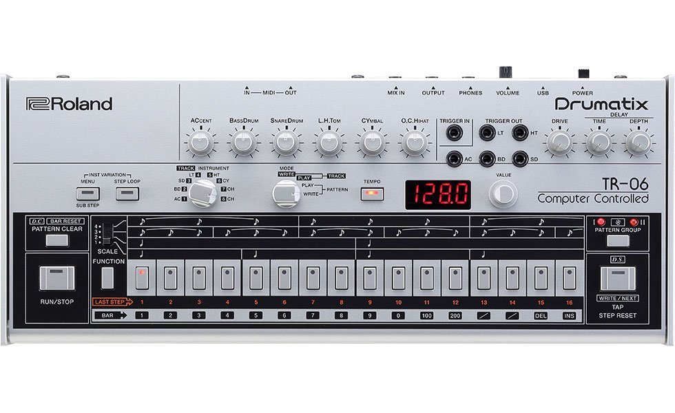 Die TR-06 dagegen ist ein Abbild der original TR-606 und ist eine Erweiterung der Roland-Boutique Serie. Vom Aussehen und Workflow gleicht die TR-06 der Drummachine aus den 80er Jahren, wurde allerdings um ein paar Features erweitert. Sowohl ein Delay und einen Drive findet man auf der Oberfläche des im klassischen Silber gehaltenen Gehäuses und zusätzlich besitzt die Neuauflage fünf Trigger-Ausgänge um eine Verbindung zu externem Modular-Equipment zu gewährleisten.