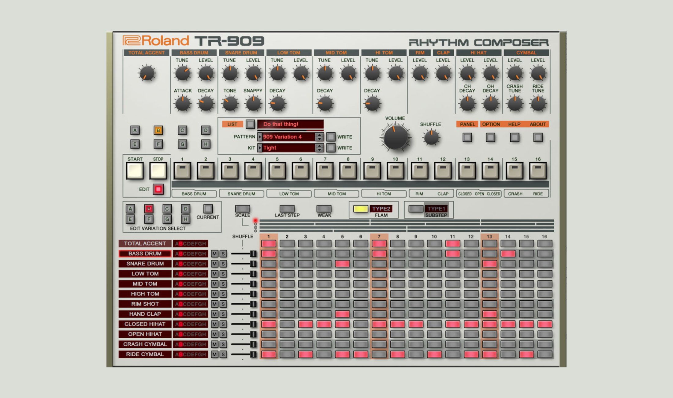 Die TR-909 gehört neben der TR-808 sicherlich zu den einflussreichsten Drum-Maschinen aller Zeiten und prägte Genren wie Techno, House und Hip Hop massgeblich. Auch 35 Jahre nachdem die 909 das Licht der Welt erblickte erfreut sich der Klassiker an großer Beleibtheit. Mit Rolands ACB-Technologie wurden die alten Schaltkreis detailgetreu nachempfunden. Die Emulation enthält gegenüber dem Original aber auch einige Erneuerungen. Innerhalb eines Pattern lassen mit dem aufgeklapten Sequenzer acht Variationen programmieren. Darüber hinaus kann die Last-Step-Funktion für polymetrische Rhythmen genutzt werden und mit sogennaten Sub-Steps lassen sich 32tel-Hi-Hats erzeugen.