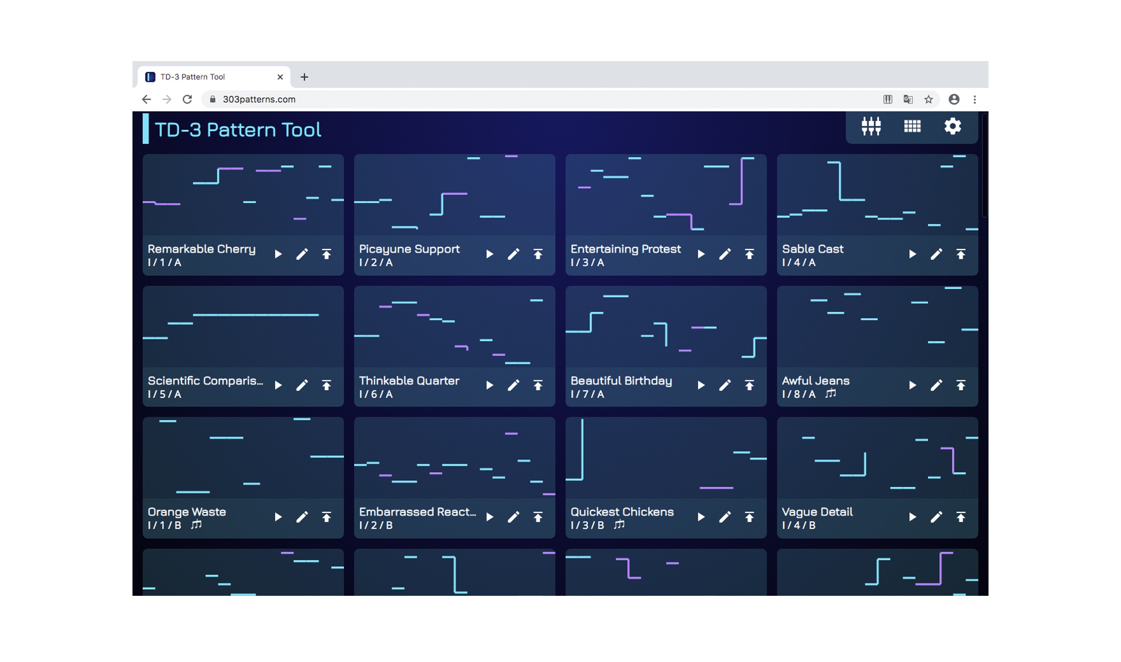 Ist die TD-3 über USB mit dem Computer verbunden, muss nur noch die Website 303patterns.com aufgerufen werden. Die Web-Applikation verbindet sich dann automatisch mit dem Bass-Synthesizer und lädt die Patterns aus dem Speicher. Die werden mit kleinen Vorschaubildern dargestellt und können zum Editieren ausgewählt werden.