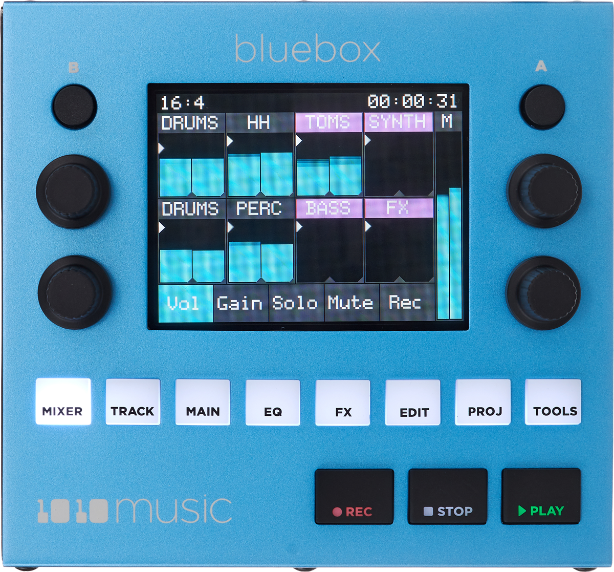Auch das 3,5-Zoll-Touchdisplay scheint das gleiche zu sein wie bei der Blackbox und bildet hier ebenfalls das zentrale Bedienelement. Erneut steuern die vier Knobs je nach Anwendungsbereich andere Parameter, wobei die Funktionstaster unterhalb des Displays durch die verschiedenen Workflow-Ebenen führen. Hinzu kommen zwei Menü-Buttons – dieses mal A und B – als weitere Navigationshilfe. Die drei Transporttaster für Record, Stop und Play erinnern vom Look an Ableton Push oder NI Maschine und runden die vorderseitigen Bedienelemente der Bluebox ab.