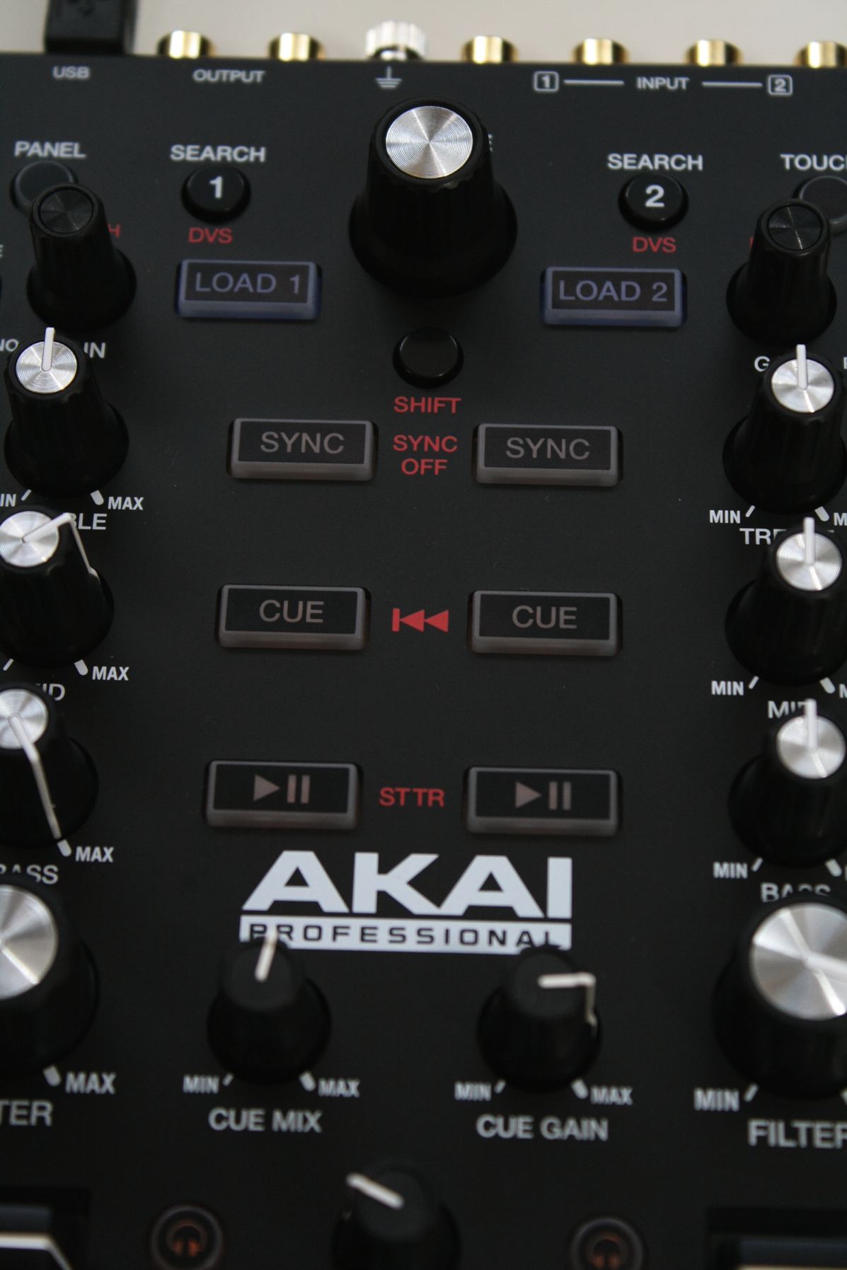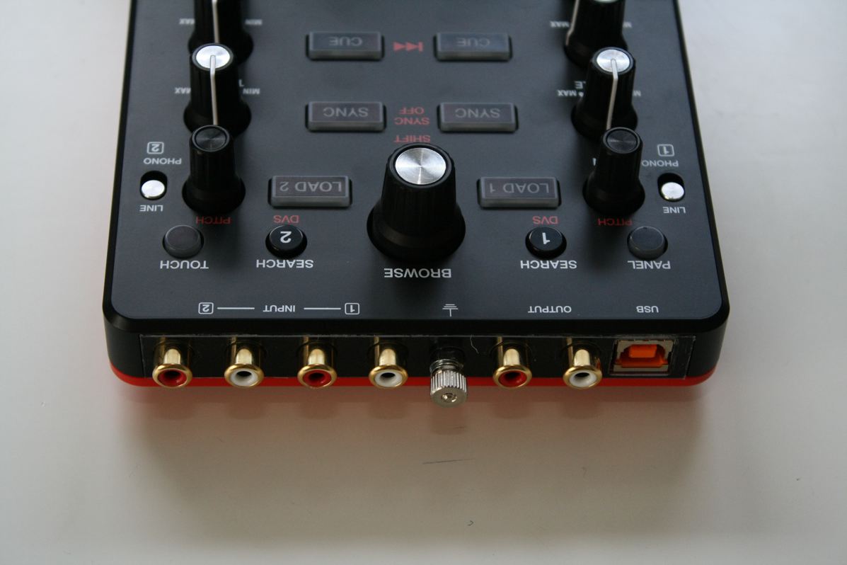 Im Inneren des Akai-Geräts steckt ein Audiointerface mit zwei Stereo-Ein- und Ausgängen, das mit 24 Bit und bis zu 96 kHz genutzt werden kann. Auf der Rückseite des AMX sind die Audioeingänge als Cinch-Buchsen ausgeführt, die mit Line- oder Phonosignalen kombiniert werden können. Das Masterausgangssignal gelangt ebenfalls über eine Cinch-Buchse an eine Verstärkeranalage, aber wahrscheinlich eher an ein zwischengeschaltetes DJ-Mischpult, da der Controller keinen separaten Booth-Ausgang besitzt.