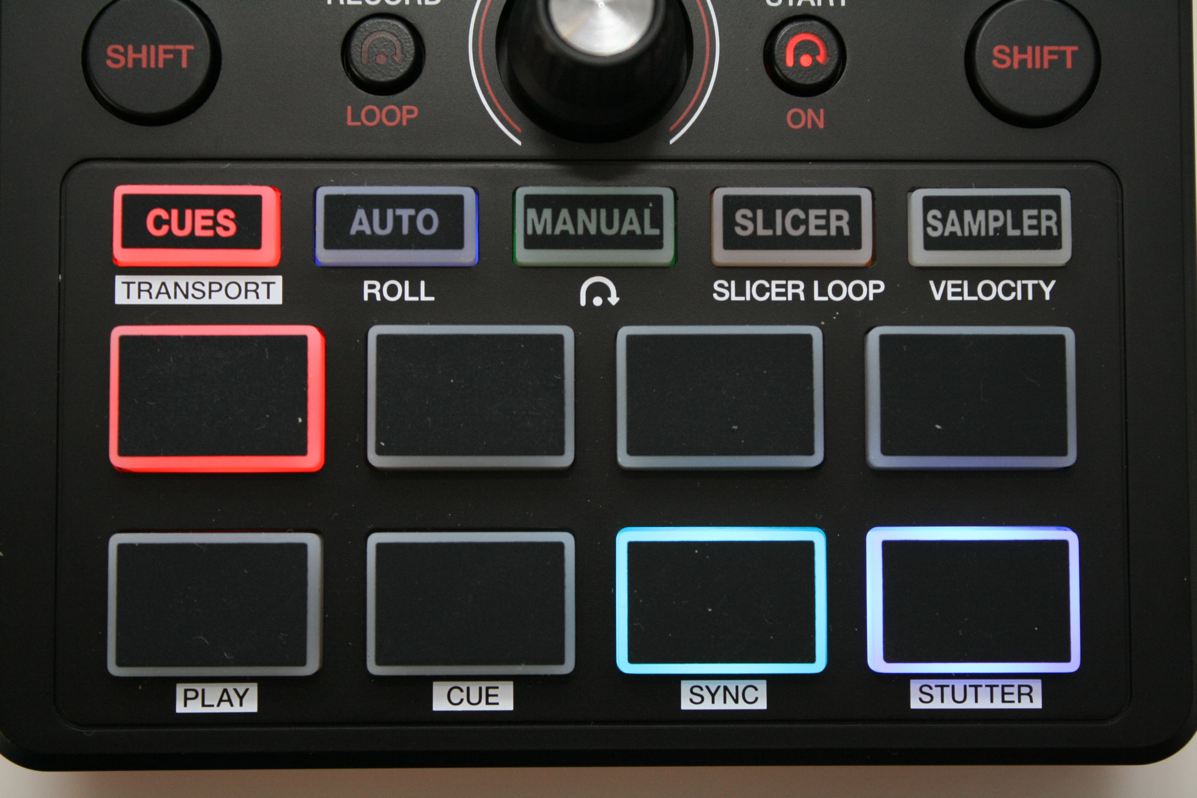 8 gummierte Pads mit Anschlagsdynamik erlauben die Bedienung von Hotcue-Punkten, Loops, der Slicer- und Flip-Funktion sowie des Samplers. Oberhalb der Pads befindet sich ein Encoder, der unterschiedliche Steuerungsaufgaben in Abhängigkeit des gewählten Pad-Modus übernimmt. Mit einem Touchstrip gelingt die Suche innerhalb eines Songs sowie das Ausführen von Pitchbend-Manövern oder die Steuerung eines Effekts.