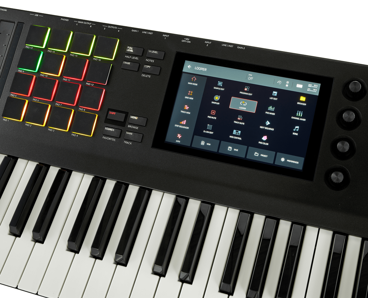 Im Gegensatz zu den samplebasierten Drum Programs, erlauben Key Group und Plugin Programs das melodische Spiel von virtuellen Instrumenten und Klangschnipseln. Bisher dienten auch hier die RGB-Pads als Eingabe-Tool, mit Scale- und Chord-Presets sowie Custom Settings. Die neue Klaviatur der MPC Key 61 bringt den Spielspaß melodischer Elemente aufs nächste Level und verfügt sogar über eine Split-Funktion.