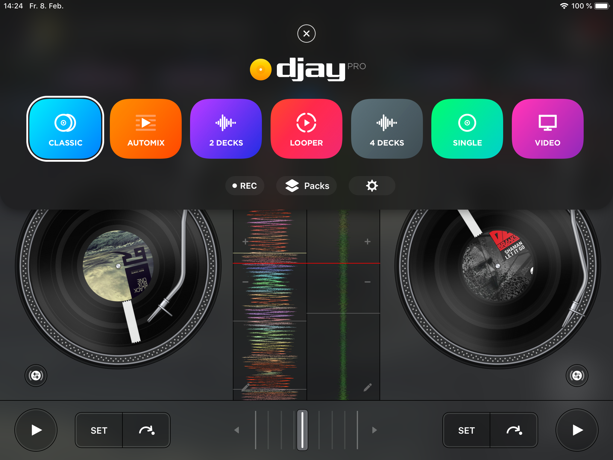 Aktiviert man die „Pro“-Features, so bietet sich ein Zugriff auf die neugestalteten 2- und 4-Deck-Modi. Diese sind an die Bedienoberfläche der Mac-Software djay Pro 2 angelehnt. Zwischen beiden Modi kann nahtlos umgeschaltet werden, ohne dass die Wiedergabe unterbrochen wird.