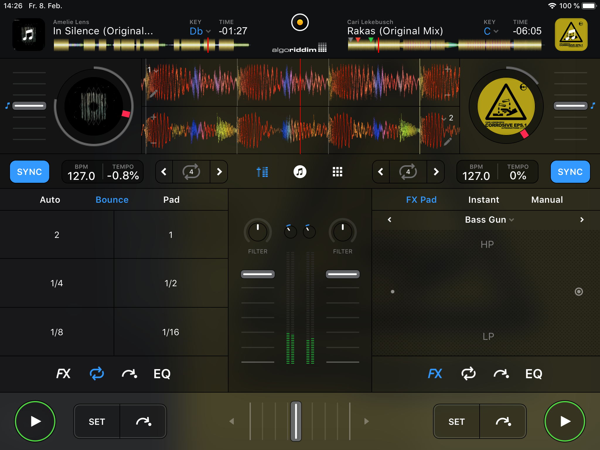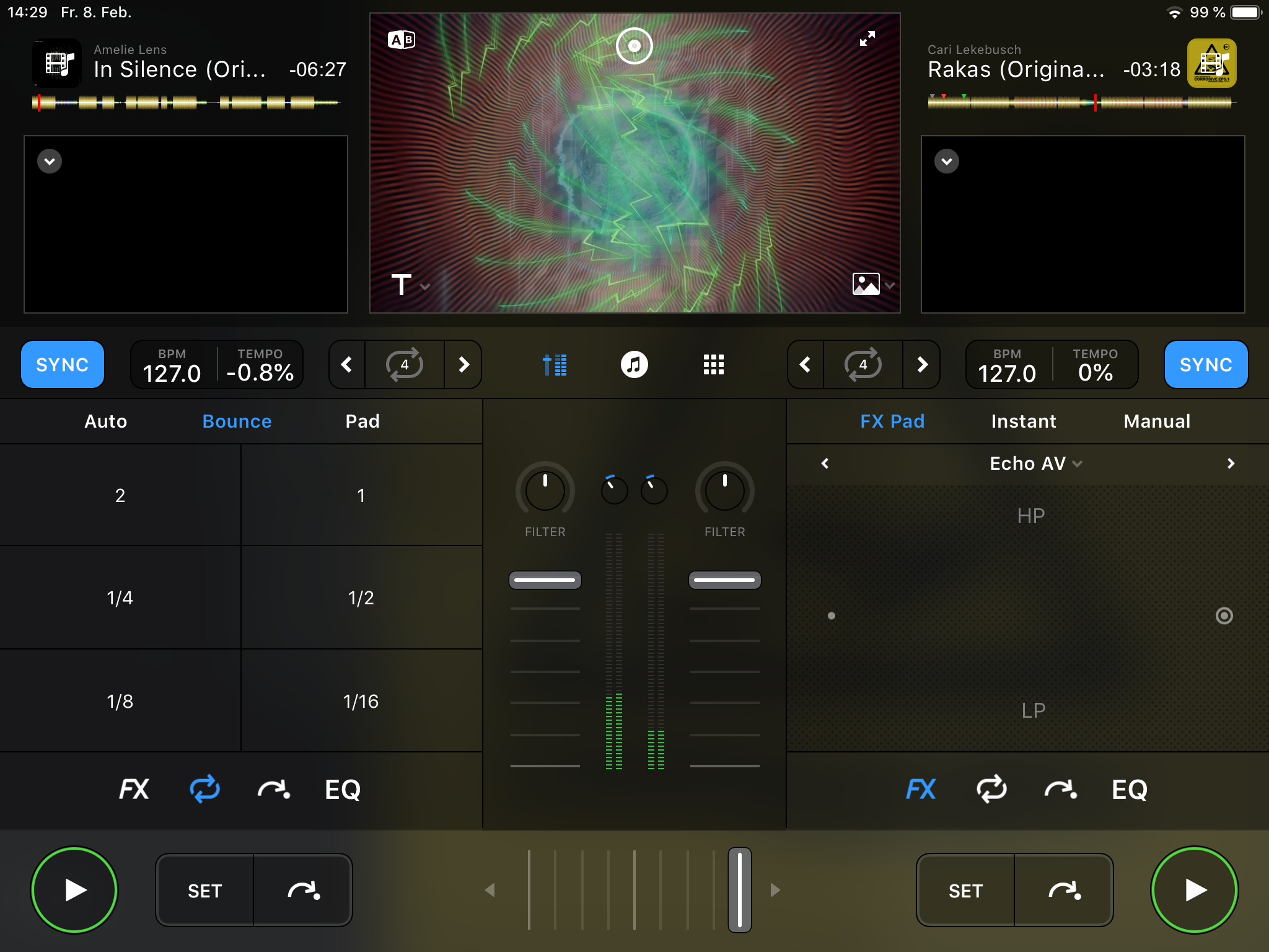 Nach dem Laden der Songs werden diese, genau wie im Classic Mode treffsicher analysiert und mit einem Beatgrid überzogen. Zum Mixen stehen Kanalfader und ein Crossfader mit einem anpassbaren Kurvenverlauf bereit, zudem gibt es gut klingende Dualmode-Filter mit Resonanz. Die App bietet eine ausgewachsene Loop-Funktion, die vorgegeben Loop-Größen, per XY-Pad steuerbare Loops in Kombination mit einem Dualmode-Filter und speicherbare Loops in frei wählbaren Größen bietet. Hier kann man sich kreativ austoben und Songteile für Mixtricks einfangen. Acht HotCue-Punkte erlauben die Markierung und das direkte Anfahren von Songstellen, die zur leichteren Identifikation individuell gefärbt sind.