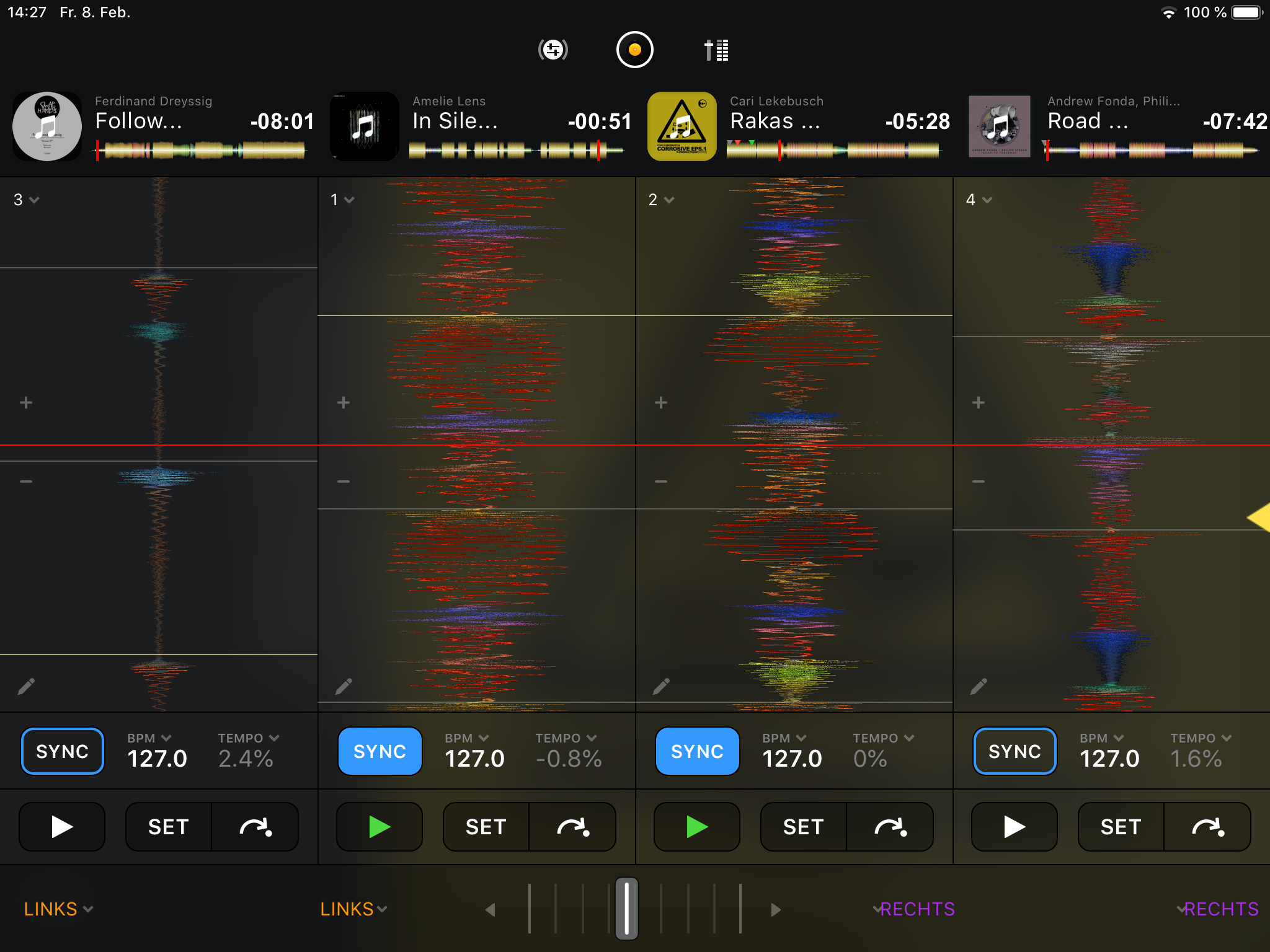 Im 4-Deck-Modus werden vier horizontale oder vertikale Wellenformen zur Songsteuerung eingeblendet. Die Angleichung erfolgt in diesem Modus am einfachsten per automatischer Sync-Funktion. Diese erlaubt auch weniger versierten Anwendern das passgenaue Vierdeck-Mixing. Aufgrund des knappen Platzangebots sind die einblendbaren Steuerungen für die kreativen Funktionen recht klein bemessen, lassen sich aber trotzdem recht gut bedienen.