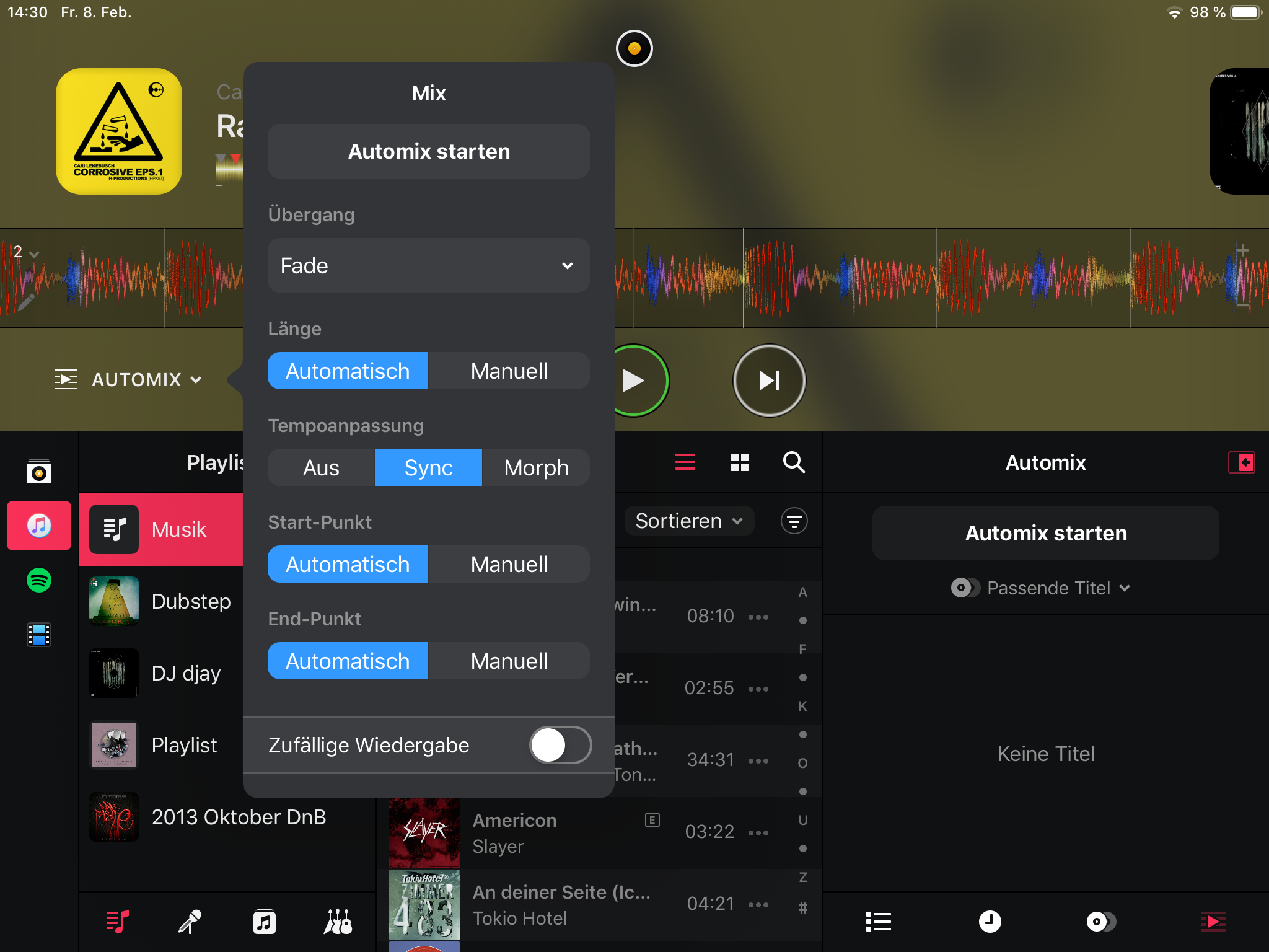 Die automatische Mixfunktion kann zur Hintergrundbeschallung genutzt werden und bietet viele Anpassungsmöglichkeiten. Die Übergangsart und -länge sind wählbar sowie die Start- und Endpunkte. Die Songauswahl erfolgt chronologisch über einen Algorithmus, der passende Titel findet oder zufallsgesteuert. Die Automix-Funktion kann während des Mixvorgangs bequem aktiviert und deaktiviert werden und funktionierte in meinem Test zuverlässig.