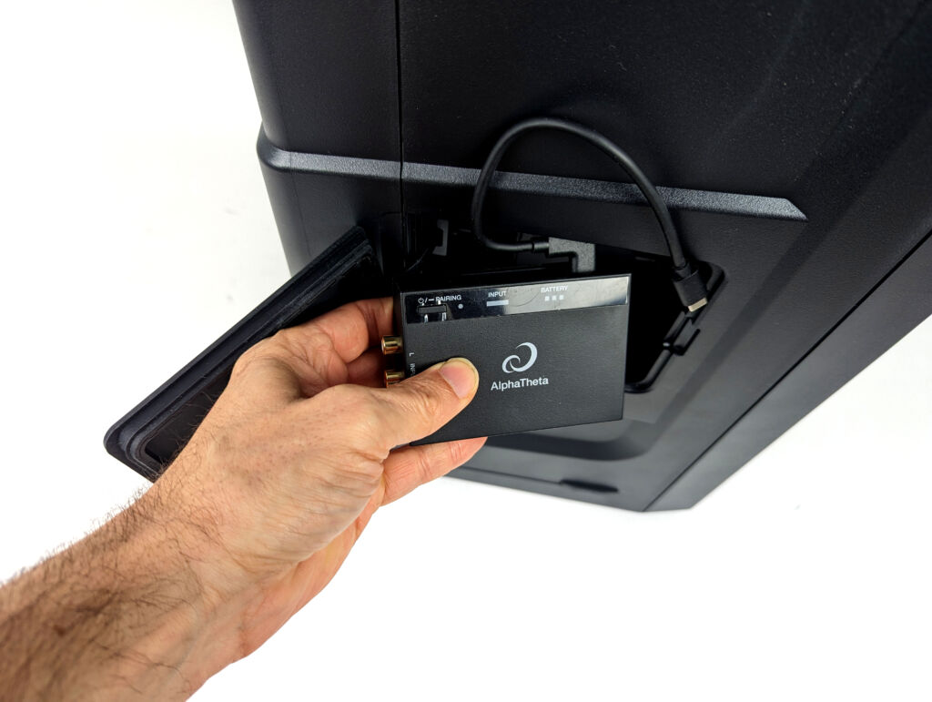 Auf der Rückseite des AlphaTheta-Geräts befindet sich im oberen Bereich das leicht zugängliche Bedienfeld. Hier gibt es einen beleuchteten Einschaltknopf und eine Betriebskontrollleuchte, die über den Ladezustand des Akkus informiert, sowie eine Limiteranzeige, die vor zu hohen Eingangspegeln warnt. Ein weiterer Taster ermöglicht die Konfiguration der Betriebsart, wenn mehrere Boxen beteiligt sind. Für die drahtlose Kommunikation mit Zuspielern und zusätzlichen Wave-Eight-Lautsprechern stehen Bluetooth-, SonicLink- und Kopplungstasten zur Verfügung. Ein Drehschalter ermöglicht die Auswahl des gewünschten Klangmodus, je nach Einsatzgebiet kann hier zwischen Subwoofer, Vocal, Flat (low cut), Flat, Music (low cut) und Music gewählt werden.