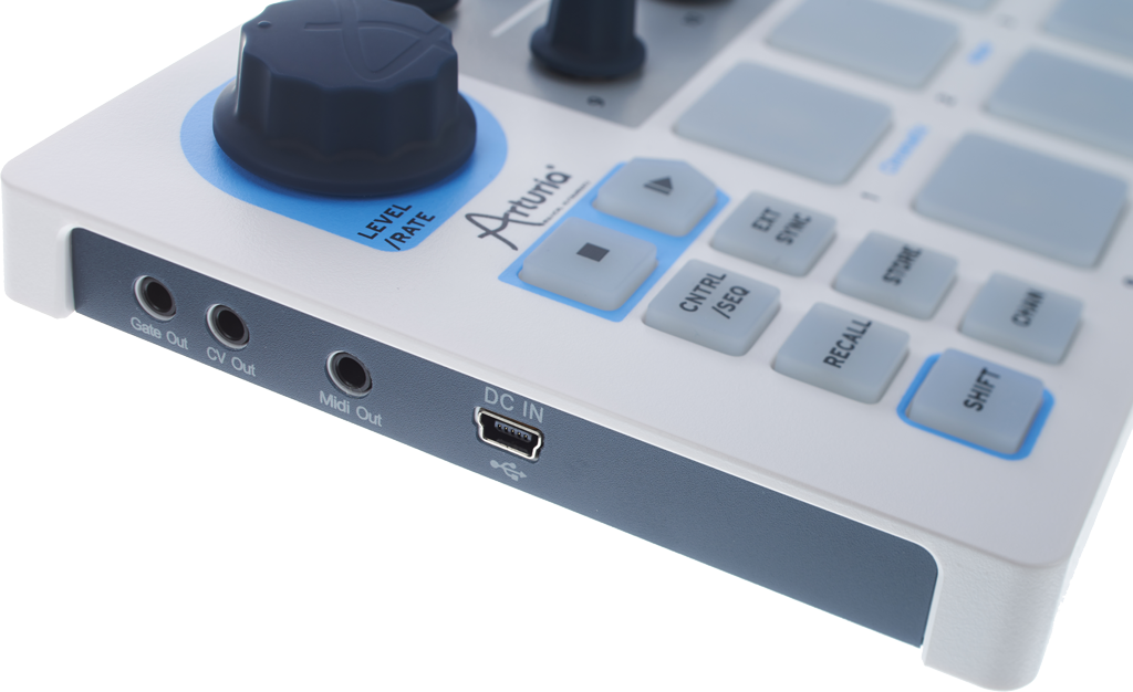 Denn als Class Compliant USB Device lässt sich der BeatStep etwa mit einem iPad verbinden und kann dann ganz ohne Stromversorgung verschiedenste Musikapps steuern. Das USB-Kabel kann den Strom aber auch von einer Powerbank beziehen, MIDI- und CV-Outs stehen schließlich immer noch als Kommunikationswege zur Verfügung. Die Anschlüsse befinden sich auf der linken Seite des BeatStep, was erneut die Laptop-Fraktion unter den Produzierenden freuen dürfte. Abgesehen vom Typ-B-USB-Anschluss sind die Buchsen im 3,5mm-Klinkenformat, für CV gibt’s noch einen extra Gate-Out.