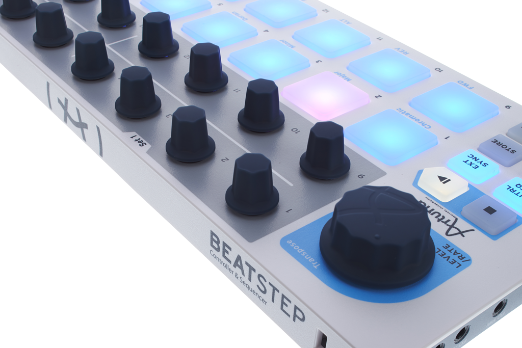 Im Zweifelsfall ist die Velocity aber justierbar, polyphoner Aftertouch und Anschlagsdynamik runden die Eigenschaften der Drumpads ab. Für diverse Utility-Funktionen stehen acht Funktionstaster bereit, die wieder mit ihrer Hintergrundbeleuchtung überzeugen und sich spürbar drücken lassen. Die ebenfalls in Achterreihen angeordneten 16 gummierten Endlos-Encoder verfügen über eine leichte Rasterung, wackeln nicht und haben einen angenehm festen Drehwiderstand. Auch die Abstände zwischen den Reglern sind ausreichend groß gewählt, sodass man den BeatStep auch mit Handschuhen bedienen kann – zum Beispiel in der kalten Jahreszeit beim Musizieren unterwegs.