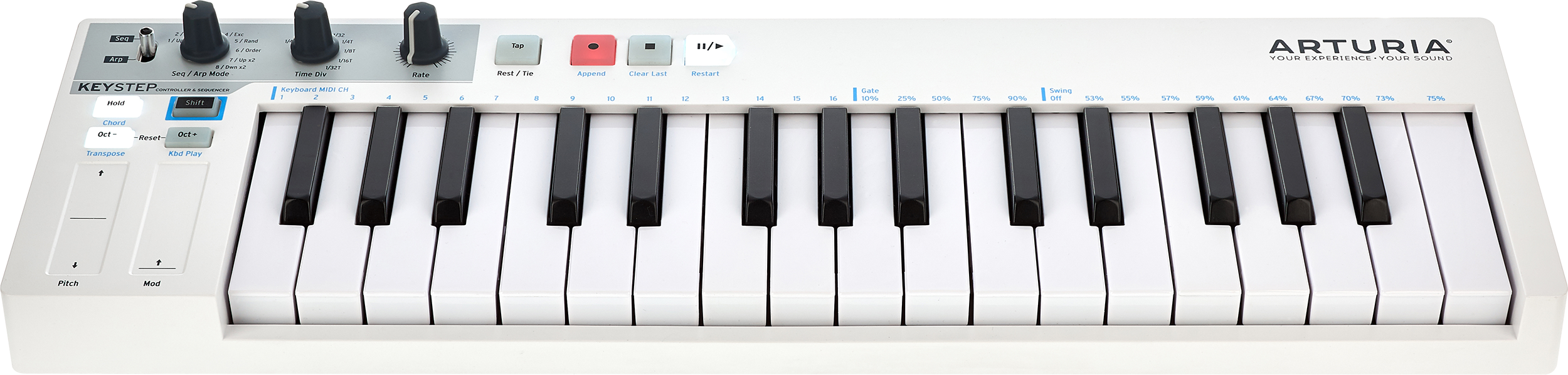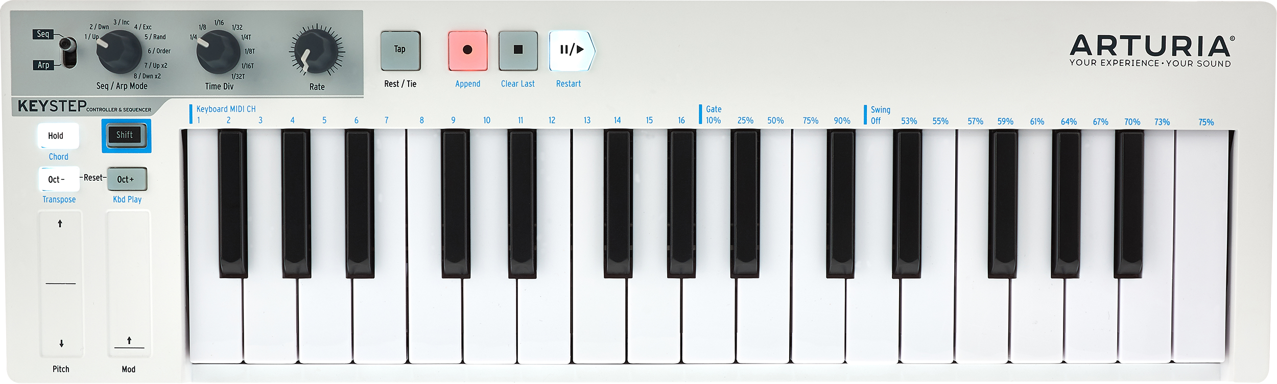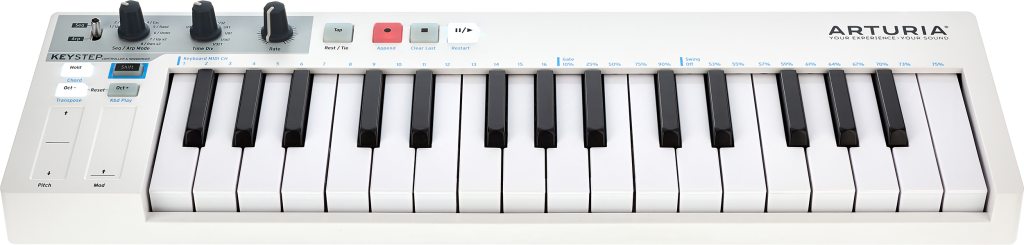 Steht der Kippschalter oben links auf “Arp” und drückt man Play, spielt der KeyStep gleichzeitig gehaltene Töne nacheinander ab. Die Reihenfolge lässt sich über den Arp-Mode-Regler bestimmen, wo acht verschiedene Patterns zur Auswahl stehen. Unter anderem dabei sind ein bis zwei Oktaven rauf bzw. runter, Random und Order – in diesem Modus orientiert sich die ausgegebene Tonreihenfolge an der Eingabe. Das Tempo lässt sich per Rate Knob regeln oder eintappen, mittels Time Div Knob wird die Subdivision bestimmt: