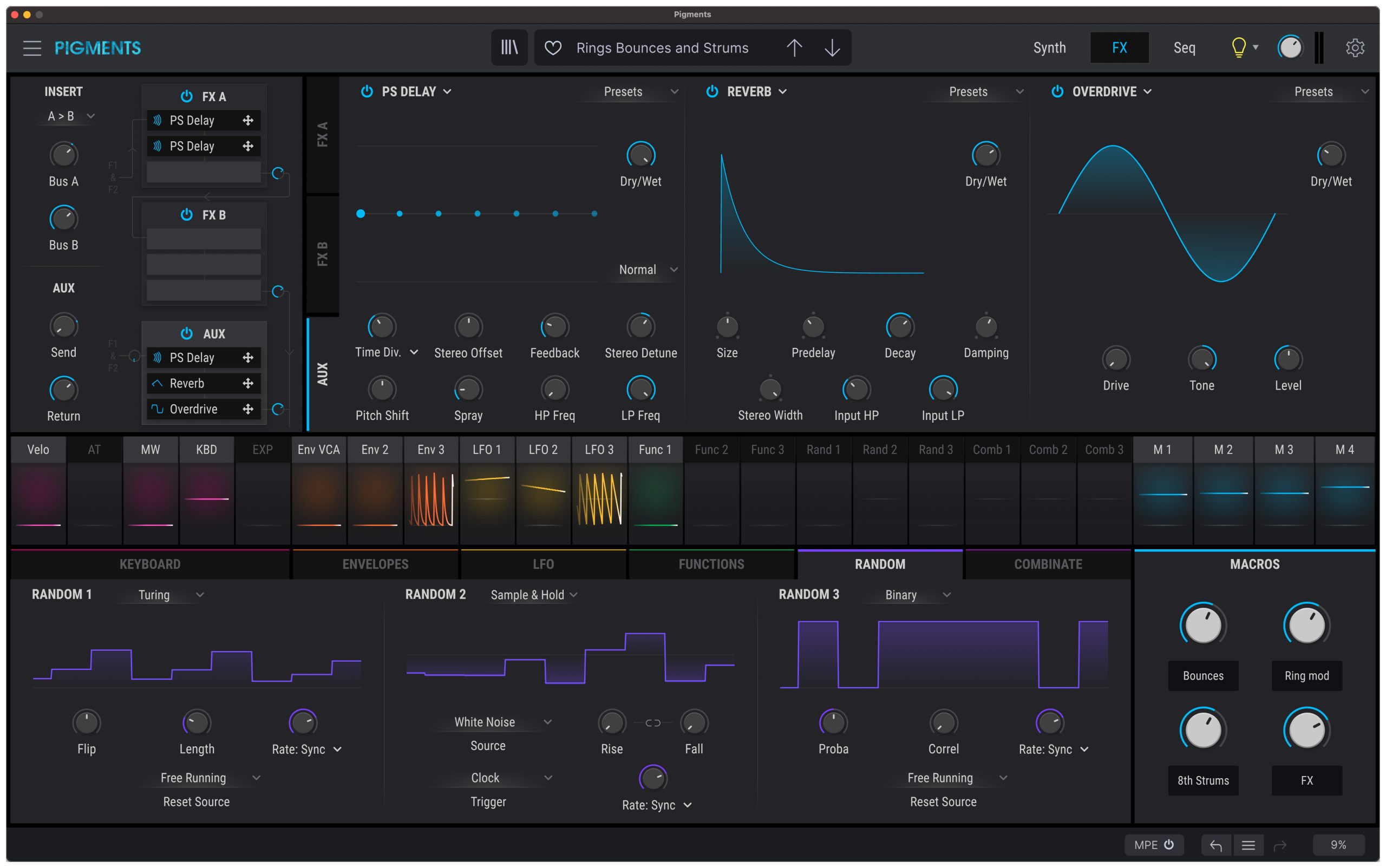 A propos Effekte: Der französische Hersteller ist neben seiner Hardware auch für seine hervorragenden Effekt- und EQ-Plugins bekannt. So wundert es nicht, dass auch Pigments 3 mit einer üppigen Anzahl gut klingender, sehr vielseitiger Effekte aufwartet. Unter insgesamt 18 Effekt-Typen finden sich eine Handvoll EQ- und Filter-basierte, Delay-, Reverb- und Modulations-Effekte, wie beispielsweise der neue “Chorus JUN-6“ der auf dem Chorus des Roland Klassikers basiert. Wie zu erwarten war, klingen alle Effekte gut bis sehr gut und lassen sich absolut praxistauglich bedienen.