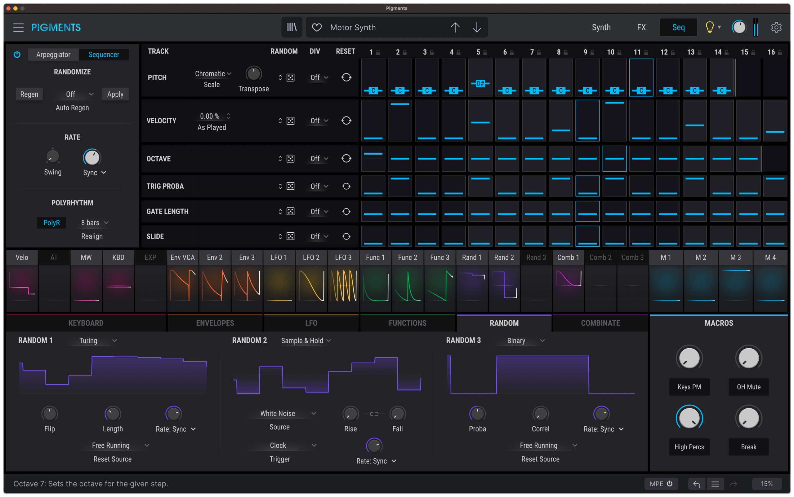 Auf den ersten Blick wirken Sequencer und Apreggiator vertraut und klassisch. Erst nach ein wenig Herumprobieren und einem Blick ins Tutorial erschließen sich die zahlreichen Möglichkeiten, die uns Pigments hier an die Hand gibt. Auf 16 Steps werden einzelne Noten (nur im Sequencer), Velocity, Octave (also gespielte Oktave innerhalb der Note von +2 bis -2), Trigger-Probability sowie Gate Length und Slide-Werte bestimmt. Zudem ist jede “Trigger-Spur“ mit einem Randomizer versehen, mit dem sich prozentual bestimmen lässt, wie sehr voreingestellte Trigger-Wert per Step auslöst werden. Noch lebhafter lassen sich die Sequenzen allerdings gestalten, indem man polyrhythmische Elemente einbaut und einzelne Trigger-Events unabhängig voneinander bzw. gegeneinander spielen lässt. Alles in Allem ist die Seq-Section des Synthesizers eine nette, anregende Spielwiese die immer wieder – und besonders bei polyrhythmischen Sequenzen – aufregende “Lucky Mistakes“ verspricht.