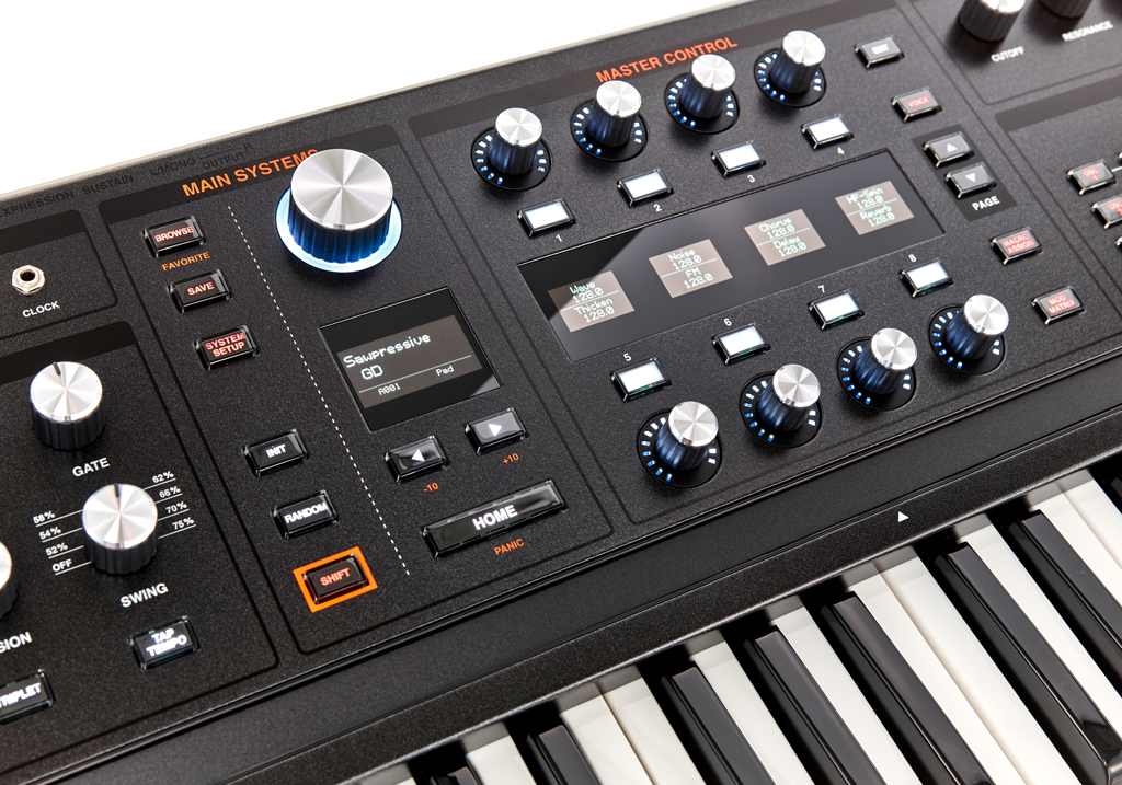 Um mit der komplexen und überzeugenden Klangerzeugung mithalten zu können, hat ASM dem Hydrasynth erstklassige Effekte spendiert. Von Chorus, Flanger, Phaser, Tremolo und Rotary bis hin zu Lofi, Kompression und EQ ist für alle etwas dabei. Wie bereits erwähnt sind zusätzlich noch Reverb und Delay mit an Bord, wobei pro Effekt vier verschiedene Unterprogramme zur Auswahl stehen. Justiert wird das ganze über die Makrosektion in der Mitte des Hydrasynth: Jeder einzelne der acht Drehregler kann bis zu acht Parameter auf einmal steuern, wobei die Displays und LED-Kränze für den Überblick im Zuweisungschaos sorgen.