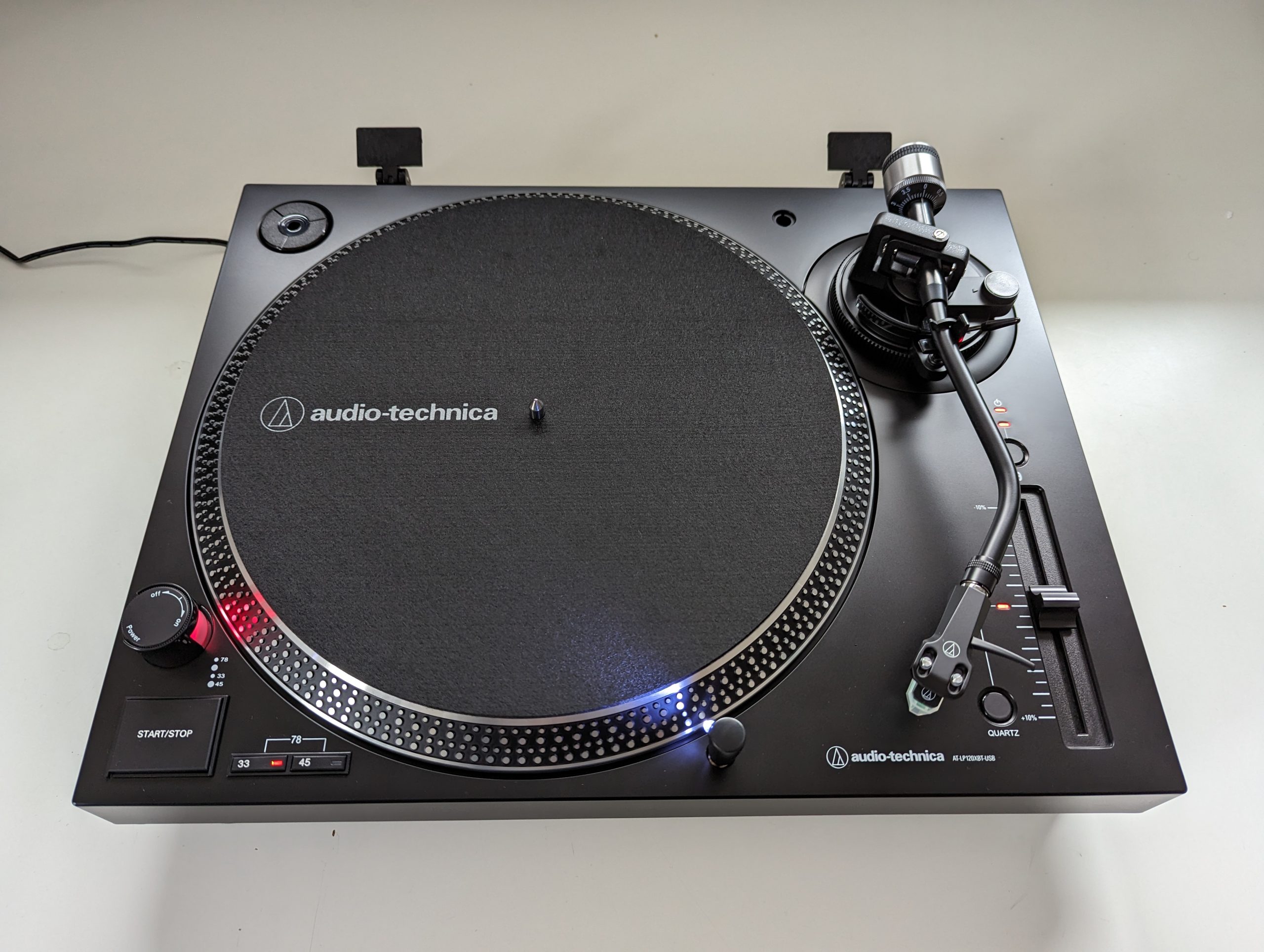 Der Audio Technica AT-LP120XBT-USB bietet ein typisches DJ-Plattenspieler-Layout, das sich über die Jahre bewährt hat. Durch einen Drehschalter an der linken Seite wird das Gerät eingeschaltet. Die Beleuchtung interagiert mit dem Dot-Muster auf dem Plattenteller, sodass sich hier die aktuelle Umdrehungsgeschwindigkeit ablesen lässt. Den Motor des Plattenspielers aktiviert man durch einen Start/Stop-Taster, über zwei beleuchtete Bedienelemente wählt man die drei Grundgeschwindigkeiten 33 1/3, 45 oder 78 U/min. Auf der rechten Gehäuseoberseite befinden sich die aufgesteckte Nadelbeleuchtung und der Pitchfader mit einem Regelweg von zehn Zentimetern.