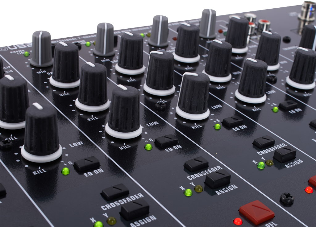 Die sieben Kanalzüge des Behringer DX2000 USB sind unterschiedlich konfiguriert. Die Kanäle eins und zwei sind als Mono-Mikrofonkanäle ausgeführt, deren Signale direkt in den Hauptmix geroutet werden. Die übrigen fünf Stereokanäle lassen sich mit Plattenspielern oder CD-/Media-Playern kombinieren und sind optional mit einem Crossfader steuerbar. Als Besonderheit besitzen die Kanalfader einen extra langen Regelweg von zehn Zentimetern und Faderkappen, die man so eher im Studiobereich antrifft.