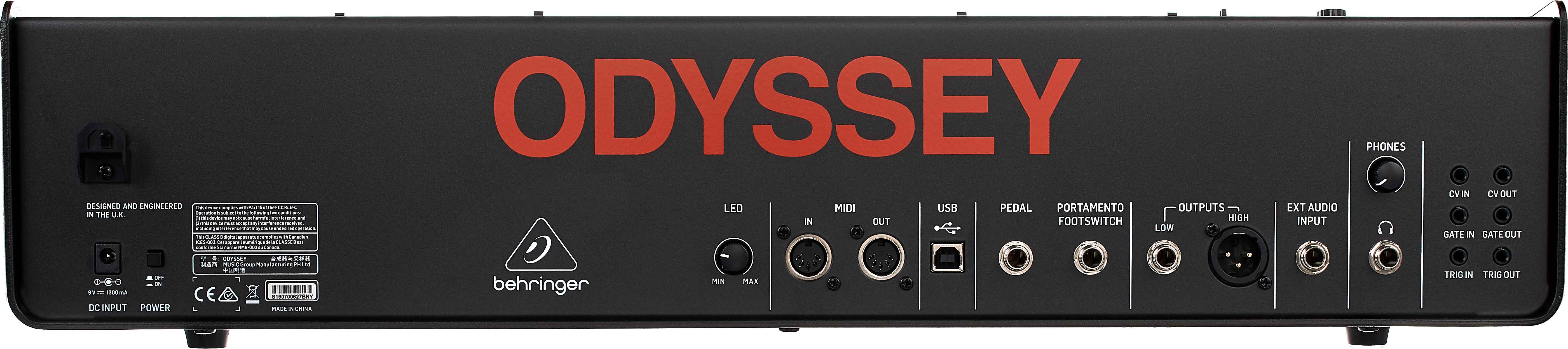 Auf der Rückseite befinden sich neben einem großen Schriftzug die Anschlussmöglichkeiten des Behringer Odyssey. Natürlich hat man dem Gerät eine MIDI-Schnittstelle verpasst, wahlweise im DIN- oder USB-Format. Darüber hinaus können analoge Signale in Form von CV-, Gate- sowie Trigger In- und Outputs sowohl verarbeitet als auch ausgegeben werden, ein externer Audioeingang ist ebenfalls vorhanden. Etwas ungewöhnlicher sind die Möglichkeiten zur Steuerung des Filters sowie der Portamento-Funktion mithilfe entsprechender Expression Pedale. Der Audioausgang in dreifacher Ausführung inklusive Kopfhörer-Anschluss und XLR-Buchse komplettiert das Angebot.