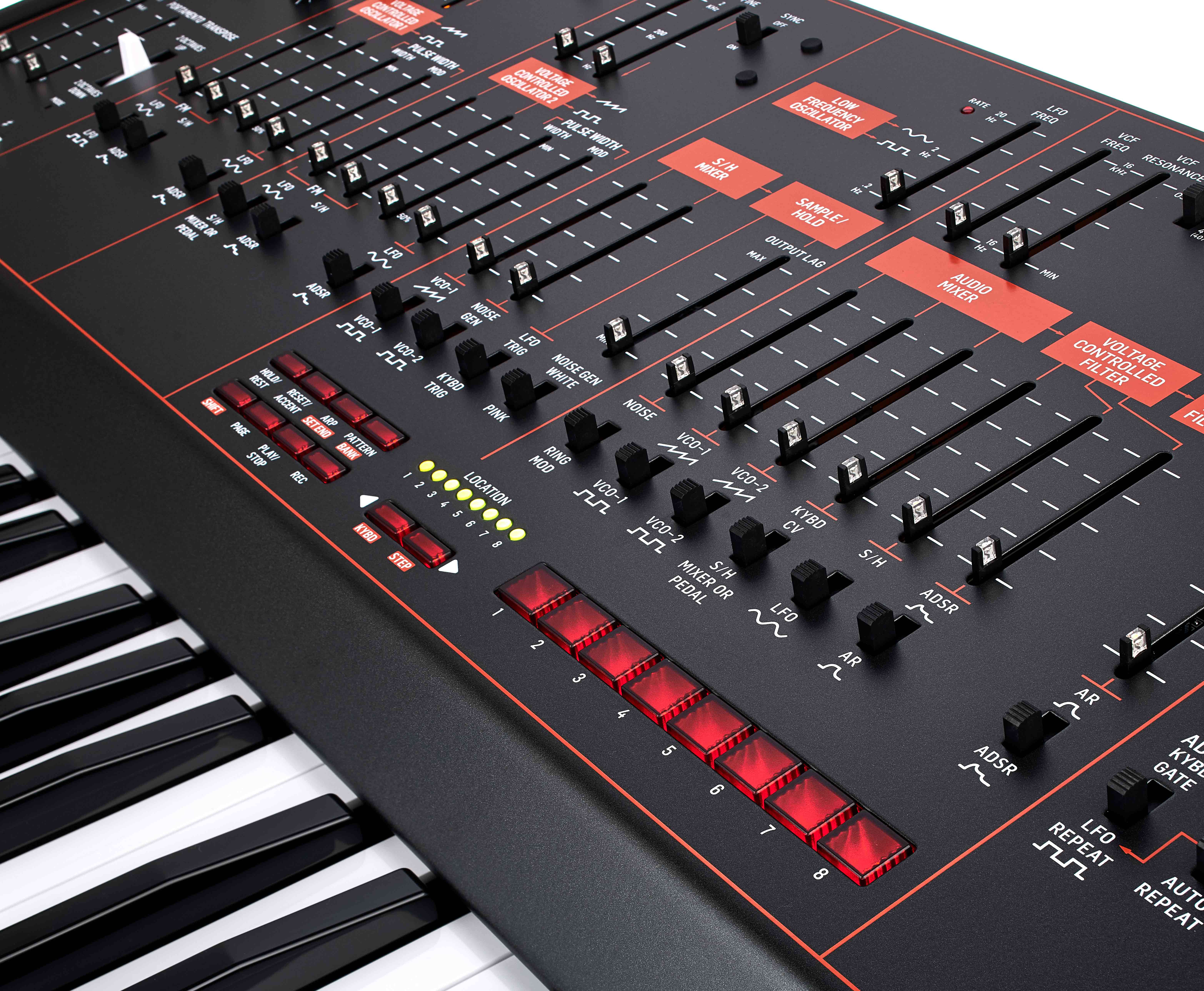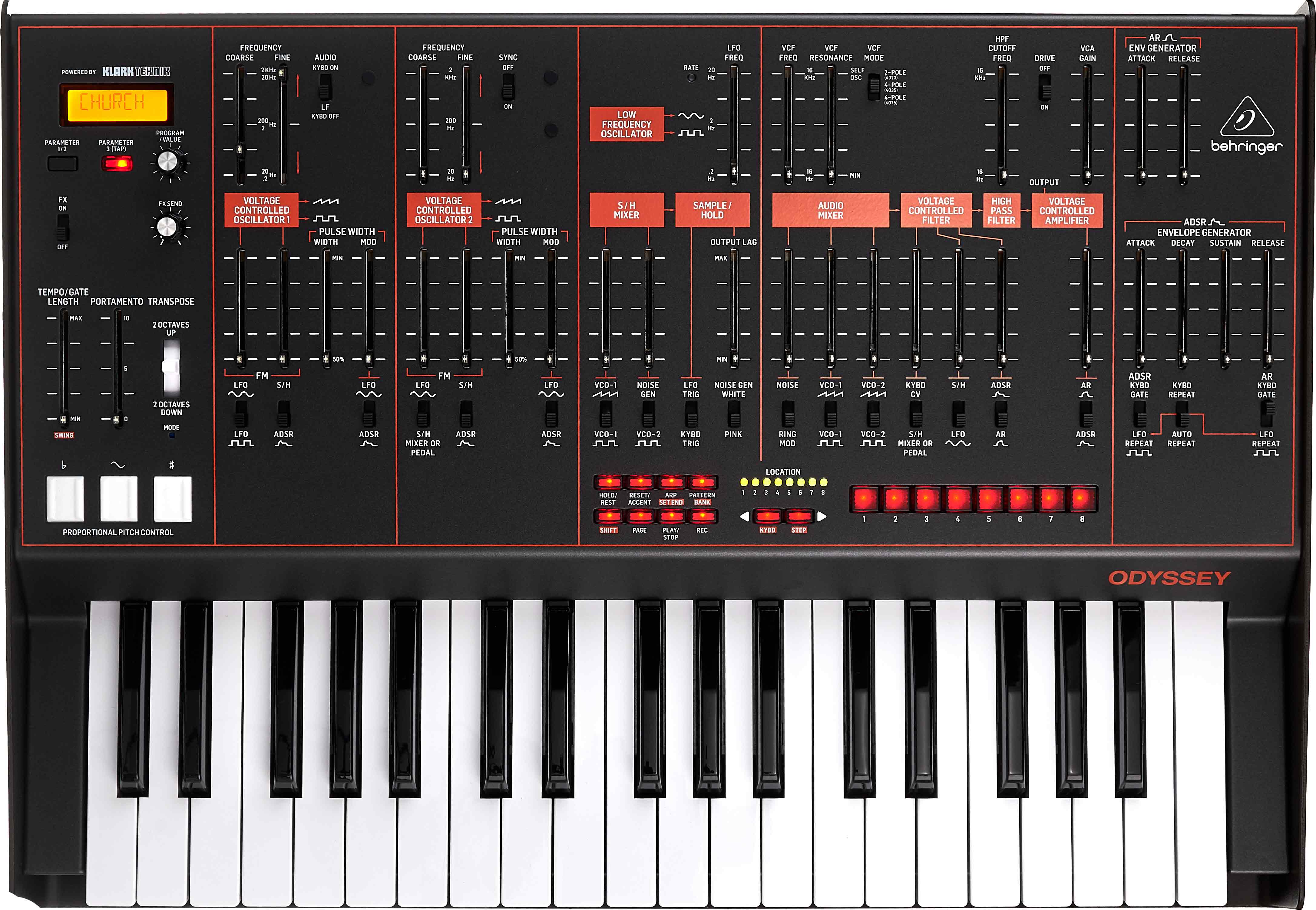 Bei genauerem Betrachten fallen dann jedoch schnell die zwei großen Neuerungen auf, nämlich der Sequenzer sowie eine Effektsektion, welche später noch genauer beleuchtet werden. Statt der sonst üblichen Drehregler werden die Parameter beim Odyssey mithilfe von Fadern eingestellt, was seit jeher polarisiert. Während Befürworter die direkte Erkennbarkeit der eingestellten Werte schätzen, bevorzugen andere wiederum das haptische Gefühl von Potenziometern.