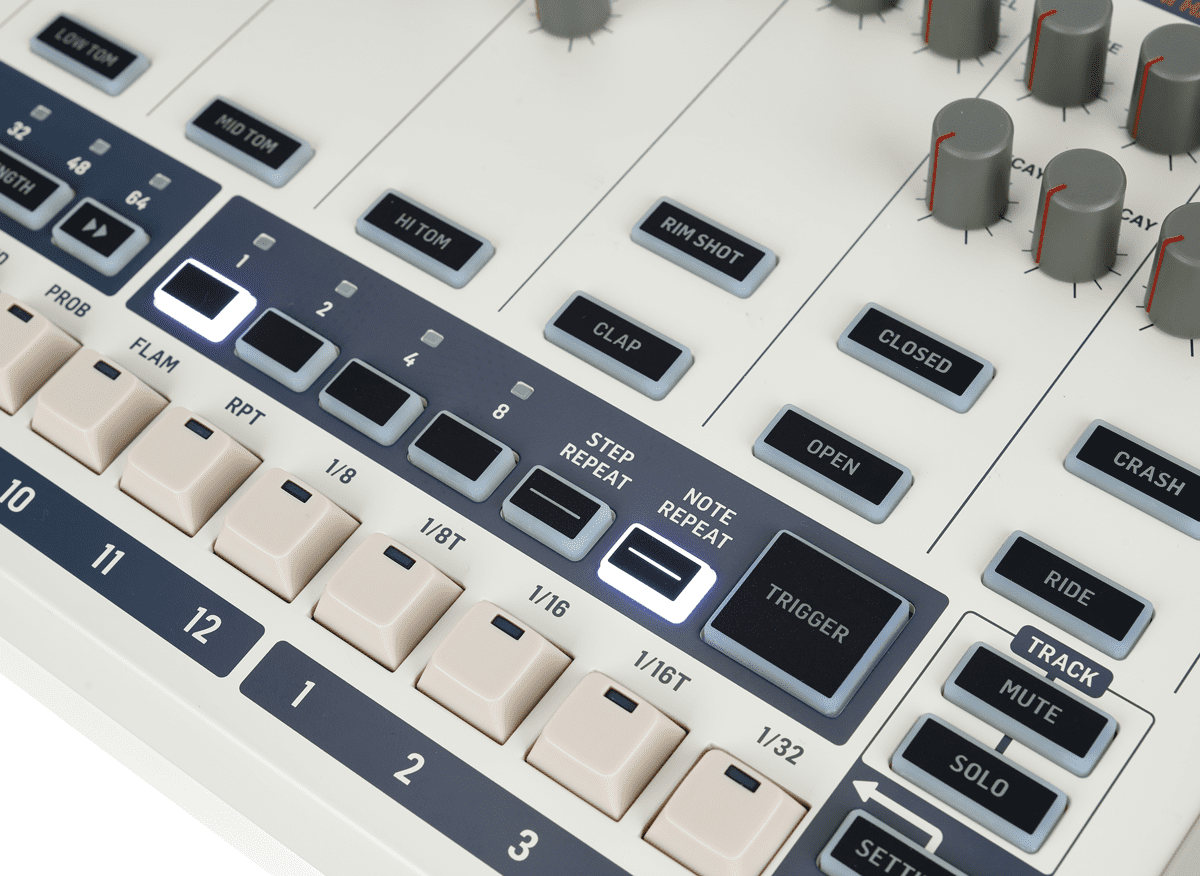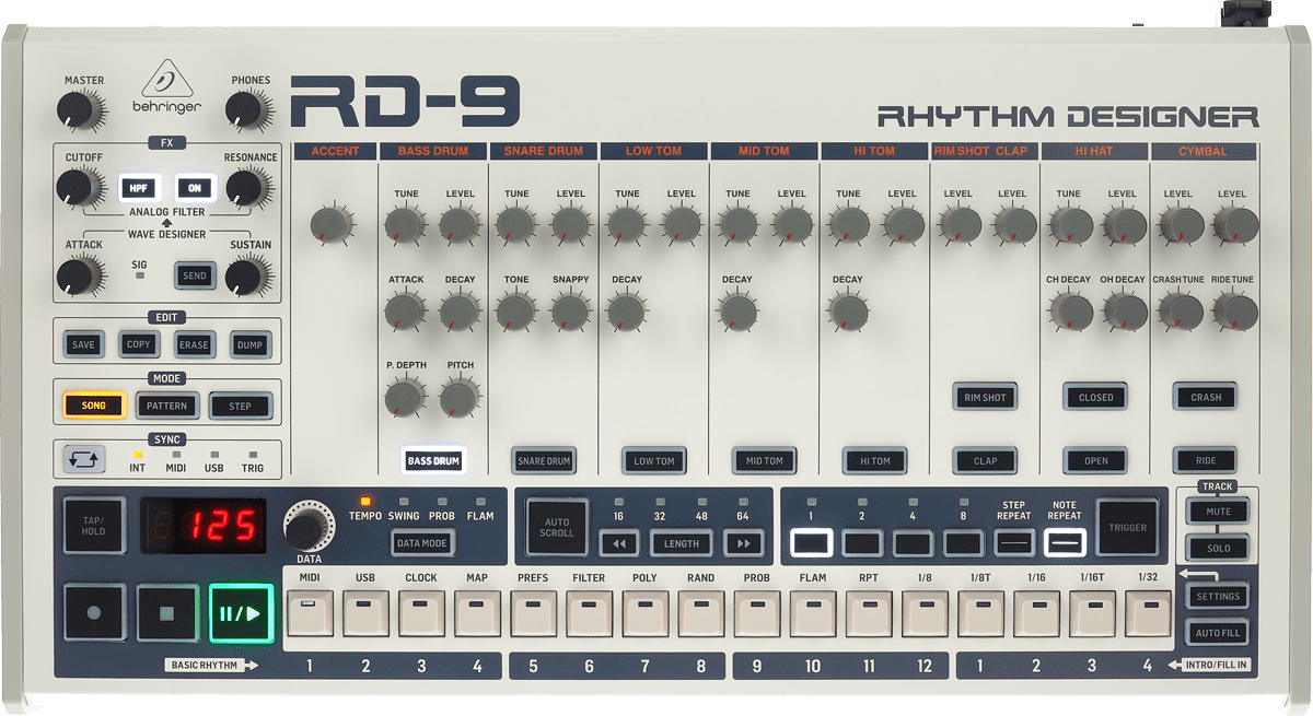 Das ist auch gut so, denn das Triggerpad wirkt ganz schön laggy – Obacht bei der Live-Performance! Mit einer Maximallänge von 64 Steps können bis zu 256 Patterns im RD-9 abgespeichert werden, die sich wiederum zu Songs verketten lassen, von denen dann 16 speicherbar sind. Akzente, Flams und Fills sorgten schon bei der 909 für die nötige Würze im Pattern und sind auch bei Behringer mit an Bord. Zusätzlich wurden noch Step und Note Repeat Feature verbaut, die sich tatsächlich gut in den Vintage-Workflow einfügen. Letzteres kann sogar auf 128tel wiederholen und klingt dabei fast wie ein Granular Synth.