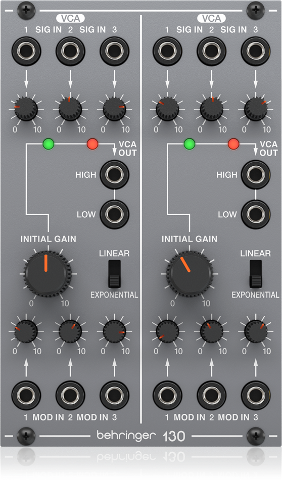 Zur Verstärkung des Signals beherbergt das Modul 130 zwei VCAs, die nach bekannter Manier durch jeweils drei Audio- sowie Modulationseingänge ins Behringer System 100 eingebunden werden. Per Initial Gain lassen sich die Verstärker permanent und ohne Zutun von Hüllkurven öffnen, die dafür zuständigen Regler arbeiten wahlweise linear oder exponentiell. Dadurch erklingt der Ton durchgehend, was sich besonders für Drones oder auch zum Soundbasteln mit beiden Händen eignet. Als Audioausgang finden sich pro Verstärker zwei Buchsen im Miniklinken-Format, jeweils für hohen und niedrigen Pegel. Das Signal lässt sich also problemlos gleichermaßen an Interfaces, Mischpulte oder auch Effektpedale weiterleiten.