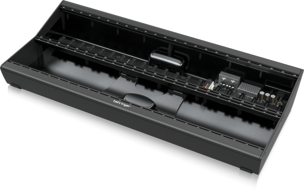 Apropos Case: Auch hier bietet Behringer mehrere Alternativen in verschiedenen Größenordnungen an. In unserem Fall handelt es sich um das Eurorack Go Case, das mit 2 Reihen à 140 TE auch für größere Modularsysteme ordentlich Platz bietet und darüber hinaus schon über ein leistungsstarkes Netzteil verfügt. Das Gehäuse kann über einen integrierten Standfuß ergonomisch günstig aufgestellt werden und lässt sich mithilfe einer eingelassenen Griffmulde komfortabel transportieren. Leider ist das Eurorack Go permanent offen und eignet sich somit weniger als roadtaugliche Lösung für unterwegs. Wer gerne mit seinem System verreist oder live spielt, sollte sich also lieber woanders umschauen.