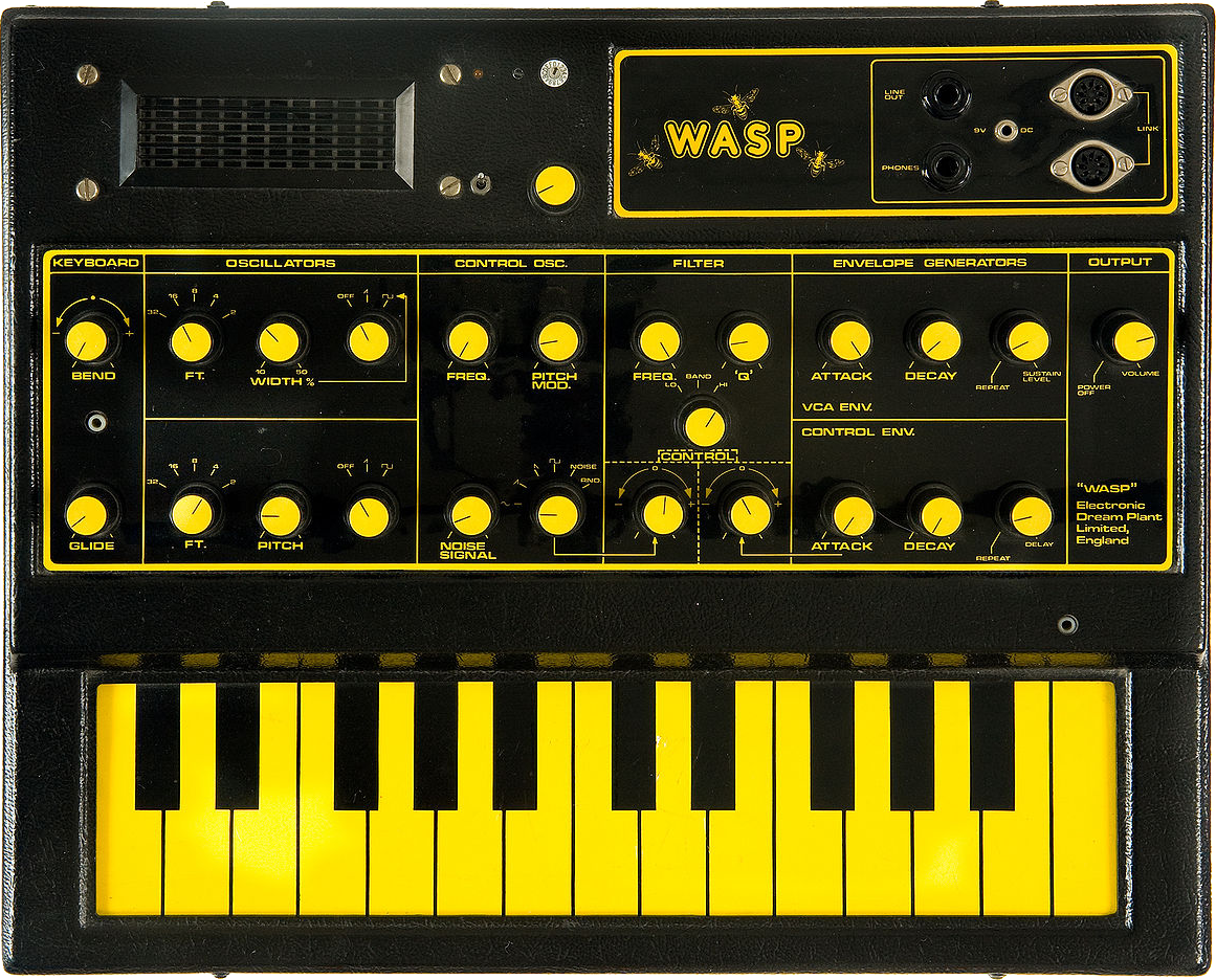 Während die meisten Vorlagen der Behringer Klone aufgrund ihres Bekanntheitsgrades keinerlei Vorstellung bedürfen, bietet sich beim eher nischenhaften Wasp Deluxe ein genauerer Blick aufs Vorbild an: Die „echte“ Wasp wurde von der englischen Synthesizer-Schmiede Electronic Dream Plant entwickelt und kam 1978 auf den Markt. Die britische Firma, die für ihre knallig designten, erschwinglichen Synths in Spielgzeugoptik und -qualität bekannt war, ging jedoch drei Jahre später bankrott.