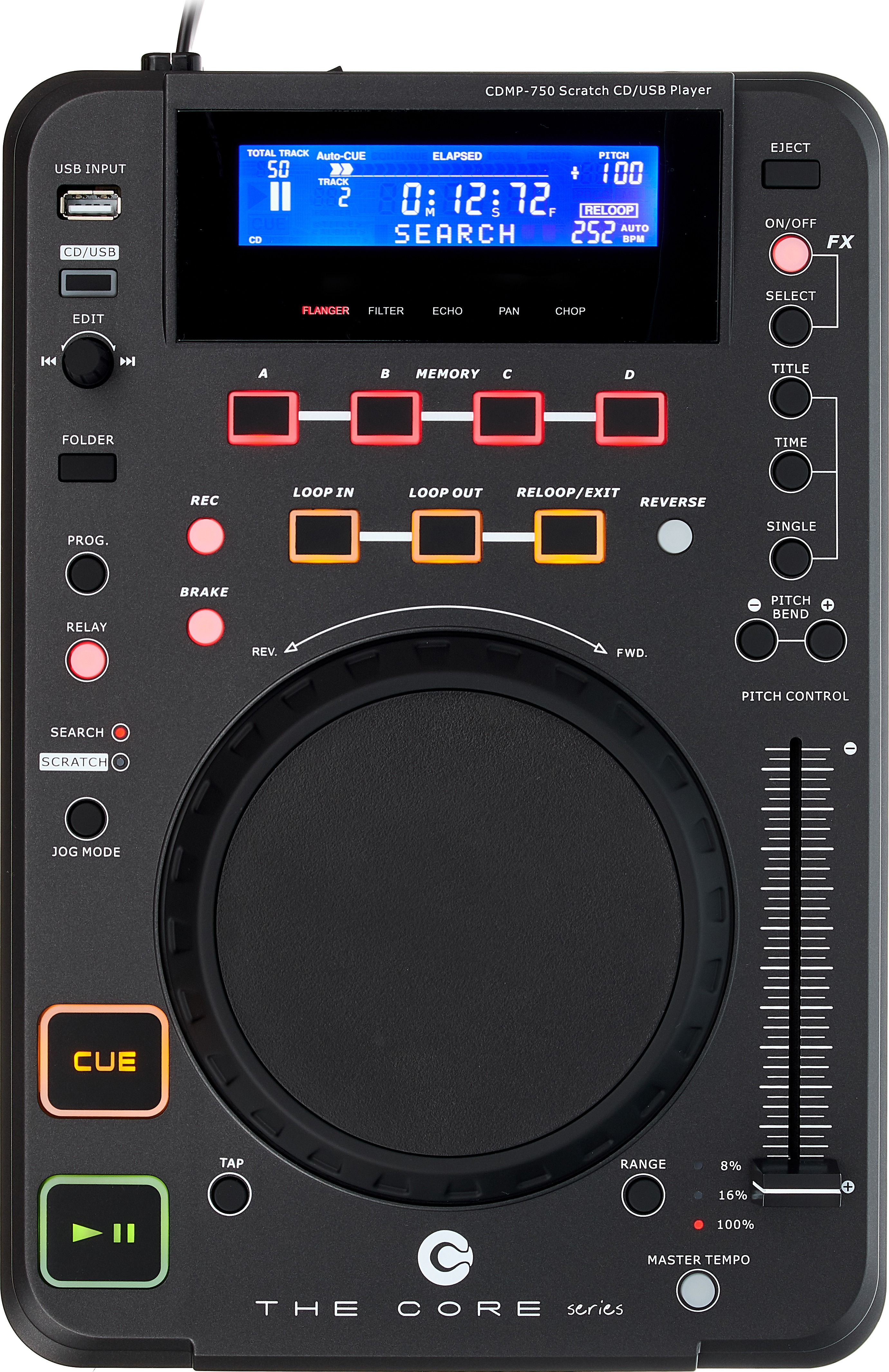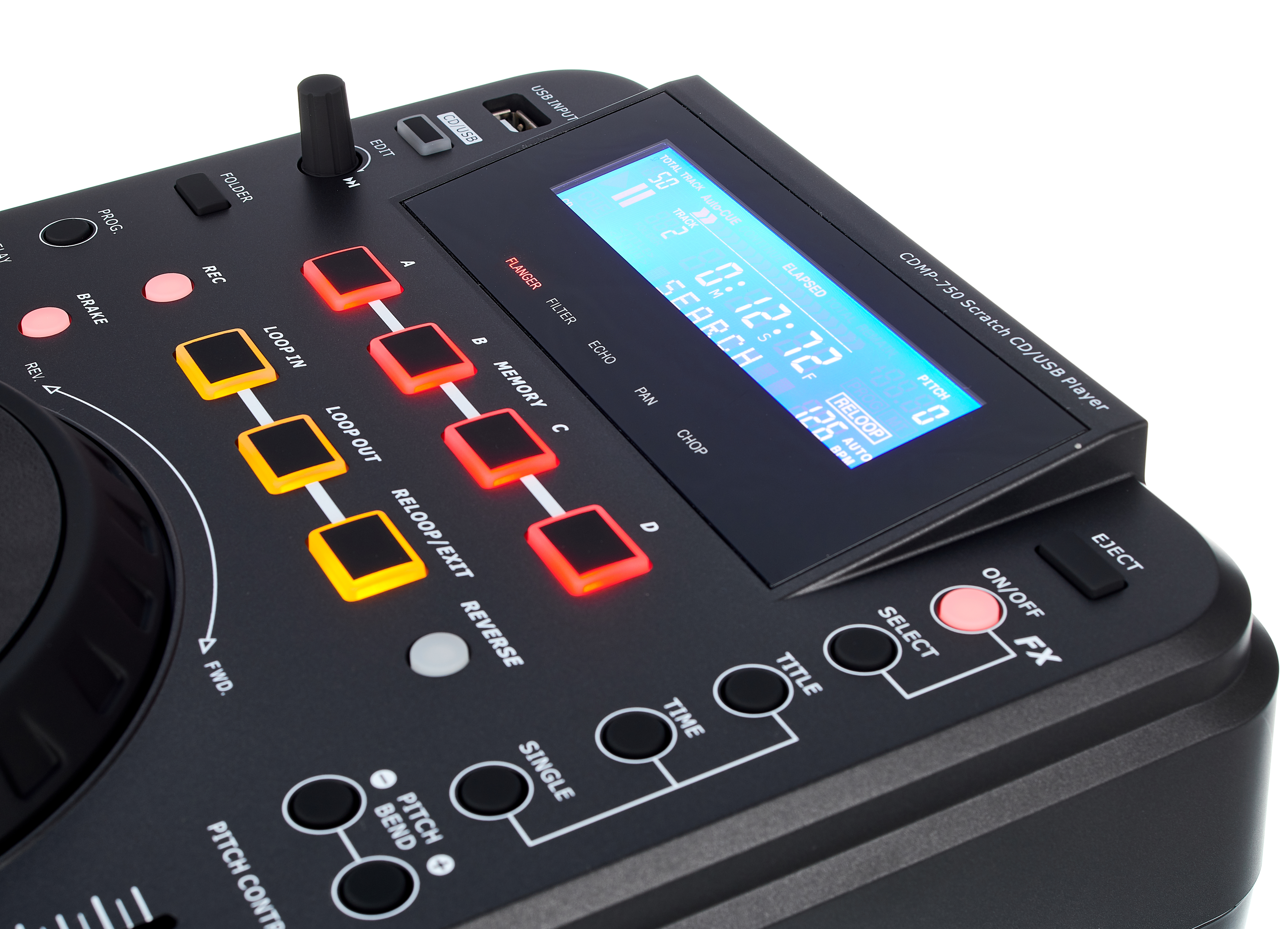Der CDMP750 verfügt zur Steuerung der digitalen Songs über beleuchtete und gummierte Taster, die sich leicht erreichen lassen. Ein recht großes, aber nicht sonderlich griffiges Jogwheel mit einem Durchmesser von circa 11,5 Zentimetern erlaubt die Navigation innerhalb eines Songs sowie das Ausführen von Scratch-Manövern und die Änderung von Effektparametern. Der Pitchfader hat einen großzügig bemessenen Regelweg von zehn Zentimetern und einen umschaltbaren Arbeitsbereich. Zudem gibt es eine optional aktivierbare Tonhöhenkorrektur, die ein harmonisches Mixen und kreative Funktionen wie Effekte, speicherbare HotCue-Punkte und Loops erlaubt. Ein blau leuchtendes und sehr gut ablesbares Display versorgt den Anwender mit zahlreichen mixrelevanten Informationen und unterstützt die Auswahl der Songs von einem Datenträger.