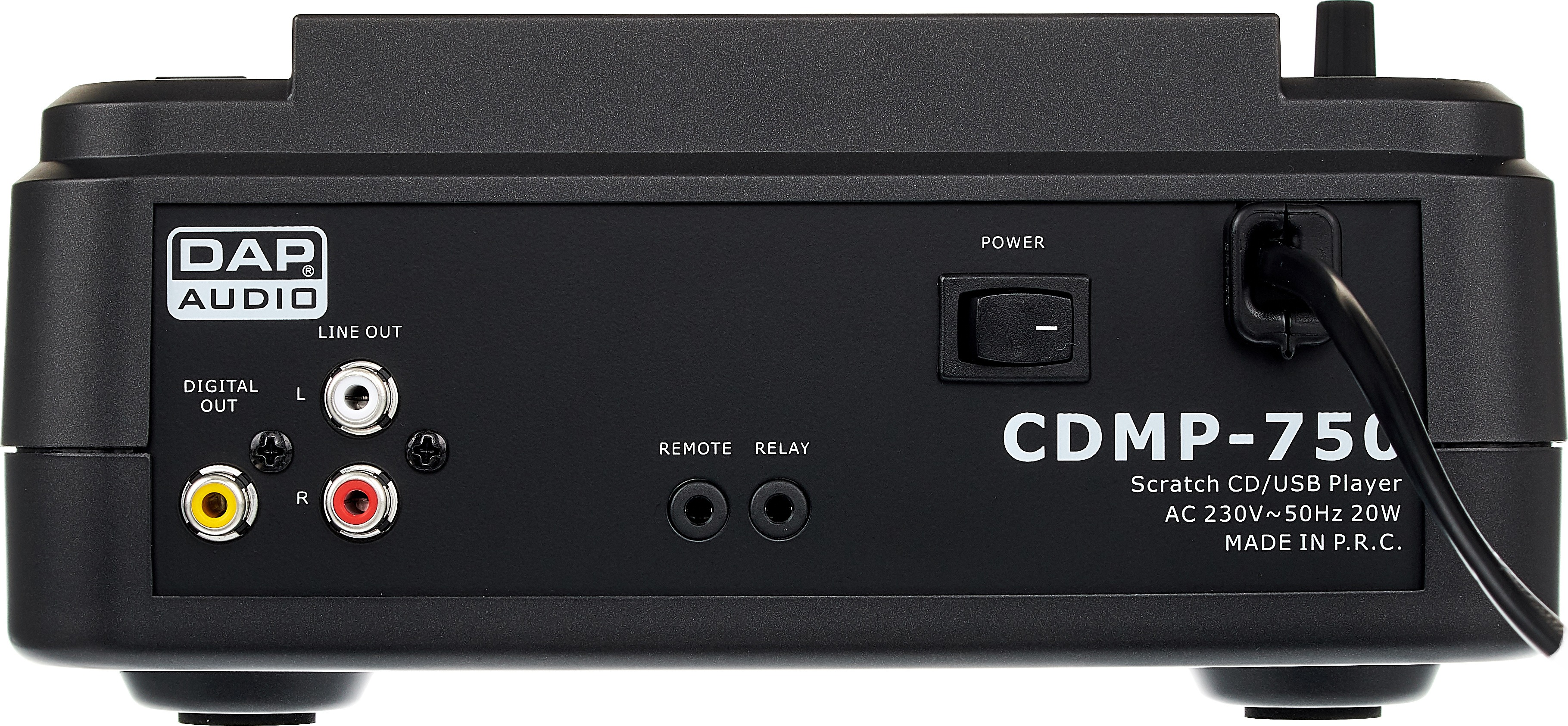 Auf der Rückseite des CDMP750 gibt es das klassische analoge Cinch-Pärchen, aber auch einen digitalen Ausgang, sodass sich der Player problemlos verkabeln lässt. Mittels einer Remote-Buchse kann eine Fernauslösung des Geräts am Mischpult erfolgen; für eine Wechselwiedergabe mit einem zweiten CDMP750 steht eine Relay-Buchse parat. Das Kabel zur Spannungsversorgung ist fest verbaut. Diese Lösung finde ich ehrlich gesagt nicht sonderlich glücklich, sie verhindert zwar ein versehentliches Herausrutschen im Betrieb, im Defektfall jedoch ist ein Austausch eher schwierig.