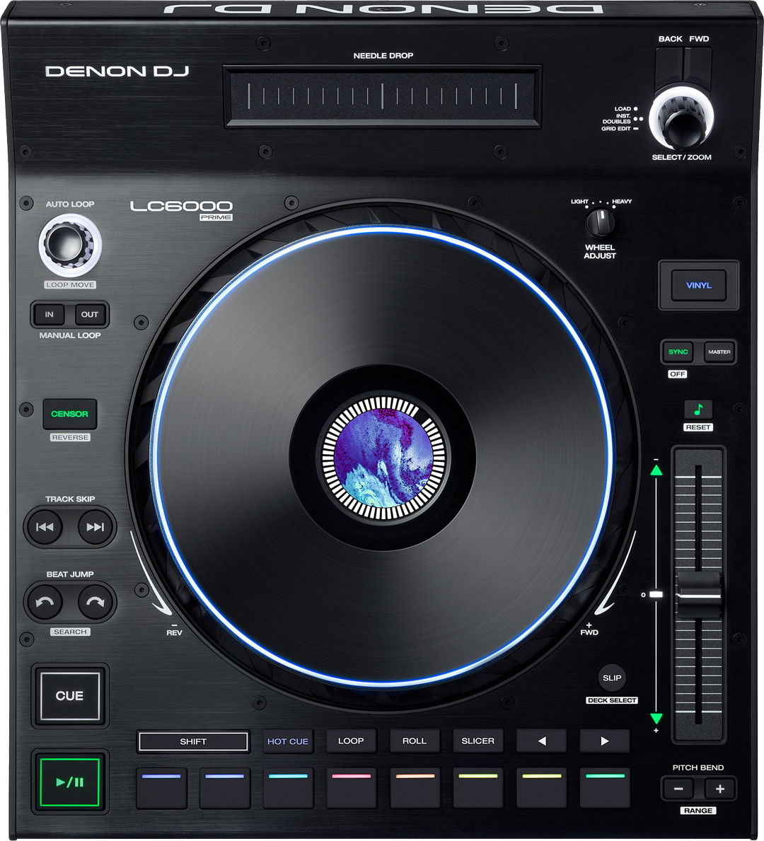 Der LC6000 Prime ist zudem mit einem 8,5 Zoll großen, kapazitiven Jogwheel bestückt, in dessen Mitte ein 3,5"Farbdisplay verbaut ist. Der Drehwiderstand des illuminierten Wheels ist anpassbar, sodass Scratch-Performer:innen die gewünschten Anpassungen vornehmen können. Zur Kontrolle kreativer Funktionen gibt es einen Censor-(Reverse-)Taster, Bedienelemente für Loops und acht Performance Pads mit verschiedenen Belegungsoptionen.