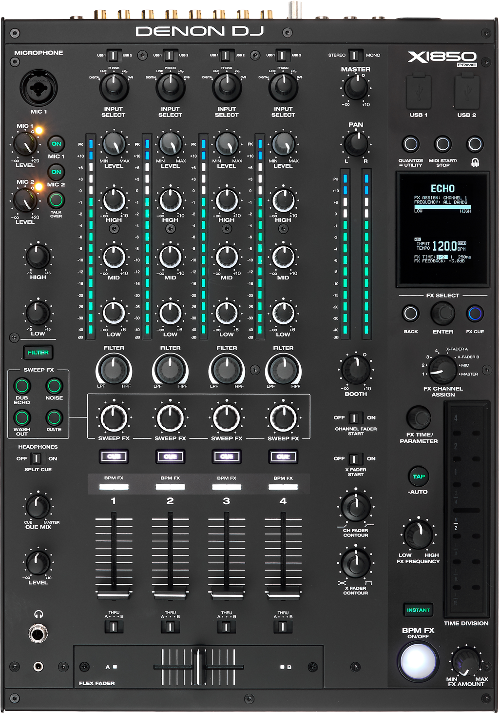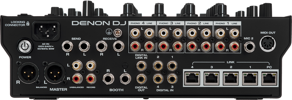 Der Denon DJ X1850 Prime kann aufgrund seiner vielen unterschiedlichen Anschlüsse in analogen oder digitalen Setups zum Einsatz kommen und mit Mediaplayern, Plattenspielern, Computern aber auch einer bunten Mischung dieser Zuspieler verkabelt werden.