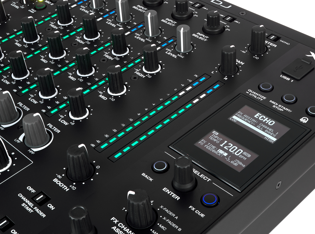Die Bedienoberfläche des Denon DJ X1850 Prime wirkt aufgeräumt, sodass eine zielsichere Nutzung möglich ist. Die Kanalzüge des Vierkanalmixers sind langgestreckt und verfügen über eindeutig beschriftete und sauber einrastende Quellenwahlregler sowie Gain-Regler und Dreiband-EQs, deren Typ (ISO, EQ) und Crossover-Frequenzen einstellbar sind. 17-stufige LED-Ketten ermöglichen die bequeme Pegelüberwachung der Eingangssignale. Mit Dualmode-Filter-Reglern lassen sich zusätzliche, mixformende Eingriffe in das Frequenzspektrum vornehmen, eine Anpassung der Filter-Charakteristik und Resonanz ist möglich, allerdings nur über die Menüfunktion. Vier praxisgerechte Sweep FX, Dub Echo, Noise, Wash Out und Gate stehen zur Modellierung von Überblendungen oder zur Beendigung eines DJ-Sets zur Verfügung. Die leicht gleitenden Kanalfader lassen sich per Schiebeschalter frei dem Crossfader zuweisen und bieten einen anpassbaren Faderkurvenverlauf.