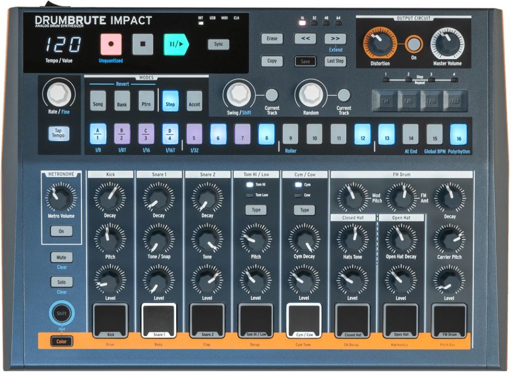Die im Vergleich zur DrumBrute geringere Anzahl an Instrumenten und dazugehörigen Klangregelungsmöglichkeiten wurde im Test als unproblematisch empfunden. Besonders das Color-Feature hat sich als innovative Neuerung erwiesen und erweitert platzsparend die Einstellungsmöglichkeiten. Die überschaubare Oberfläche der Drum Machine kommt so dem Workflow zugute: Alles ist direkt per Button oder Poti regelbar, digitale Menüs gibt es zum Glück nicht und die Doppelbelegungen mittels Shift-Button sind sinnvoll gesetzt und schnell verinnerlicht. In komplizierteren Setups stören wahrscheinlich die fehlenden Einzelausgänge und die Miniklinkenbuchsen. Am Ende des Tages überzeugt jedoch der Sound der DrumBrute Impact. Die einzelnen Instrumente sind gut aufeinander abgestimmt und in den seltensten Fällen One-Trick-Ponys. Natürlich klingen nicht alle Einstellungen gleich gut, wer geduldig schraubt, wird jedoch mit einer Menge an unterschiedlichen tollen Klangfacetten belohnt.