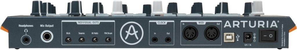 Die DrumBrute Impact verfügt über einen USB-Anschluss und kann so beispielsweise als rudimentärer MIDI-Controller fungieren, oder Patterns und Songs an den PC bzw. Mac übertragen. MIDI Ins und Outs unterscheiden die DrumBrute Impact von ihren Urahnen zweiten Grades 808 und 909 und sind eine unverzichtbare Ergänzung zur analogen Klangerzeugung – in dem Preissegment keineswegs selbstverständlich. Der gesamte Mix wird mittels 6,35 mm Stereoklinke ausgegeben. Zusätzlich verfügt die Drum Machine über 3,5 mm Klinkenausgänge für Kick, Snares, Hi-Hats und FM Drum. Sobald ein Kabel in eine dieser Buchsen gesteckt wird, verschwindet die jeweilige Stimme vom Mix-Ausgang. Separate Ausgänge für die anderen Stimmen gibt es leider nicht und auch die kleinen Klinkenbuchsen sind eher unpraktisch. Dedizierte Clock Ins und Outs ermöglichen außerdem die Synchronisation mit Geräten, die über kein MIDI verfügen.