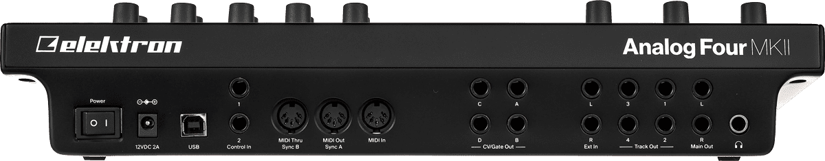 Auch die rückseitige Anschlusssektion hat ein paar Upgrades bekommen. So gibt es jetzt vier Buchsen im 6,35mm-Klinkenformat für jede der einzelnen Synth-Spuren sowie vier CV-/Gate-Ausgänge in derselben Größe. Hinzu kommen zwei Main Outs, zwei CV-Eingänge, zwei External Ins und der Kopfhörerausgang, alle als große Klinken. Für noch mehr Connectivity sorgen das voll ausgewachsene MIDI-Trio aus In, Out und Thru und ein USB-B-Slot für Firmwareupdates oder Overbridge. Per USB können aber auch MIDI- und DIN-Sync-Signale vom Rechner empfangen werden. Ein Eingang fürs Netzteil und der zugehörige Powerswitch runden das Buchsenarsenal ab.
