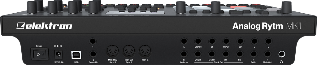 Die meisten Anschlüsse des Elektron Analog Rytm MK II sind im 6,35mm-Klinkenformat gehalten und befinden sich auf der Rückseite des Geräts. Für den Master als Stereosumme gibt es zwei Ausgänge (links und rechts) sowie einen Headphone-Out. Die acht einzelnen Stimmen des Rytm besitzen mittlerweile jeweils eigene Buchsen zur Signalweitergabe, während beim Vorgängermodell noch zwei Sounds pro Ausgang via Y-Kabel abgegriffen werden mussten. Wer mit der internen Klangregelung des Rytm anderes Gear veredeln will, nutzt dazu die beiden External Ins, neu bei MK II sind die beiden Audio Ins zum Samplen – dazu später mehr.