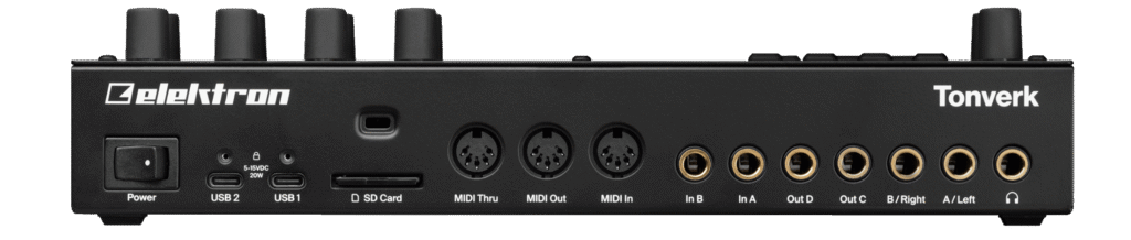 Die Audioanschlüsse des Tonverk sind im 6,35mm Klinken Klinkenformat gehalten, symmetrisch und in Zweiergruppen eingeteilt: Ausgänge A und B sind praktisch die Main Outs, C und D sind Auxiliary Outs und die Stereobuchse für die Kopfhörer ist intern als Ausgänge E und F gekennzeichnet. Im Routing Kapitel weiter unten könnt ihr nachlesen, was sich mit den Ausgängen alles anstellen lässt. Für MIDI gibt es entweder das typische Trio aus MIDI-IN, -THRU und -OUT oder eine der zwei USB-C-Buchsen.