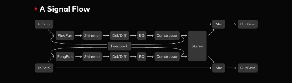 Es ist wichtig zu erwähnen, dass der Pitching-Effekt im Signalfluss vor der Delay-Sektion sitzt. Das bedeutet, dass jede Wiederholung des Echos erneut geshifted wird. Bei Oktaven ist das noch relativ unproblematisch, alle anderen Intervalle enden aber schnell in tonalem Chaos. Das muss aber nicht per se schlecht sein und ist für das Sounddesign durchaus zu gebrauchen. Trotzdem wäre es schön gewesen, über das Menü das Routing so variieren zu können, dass der Pitch Shift konstant bleibt.