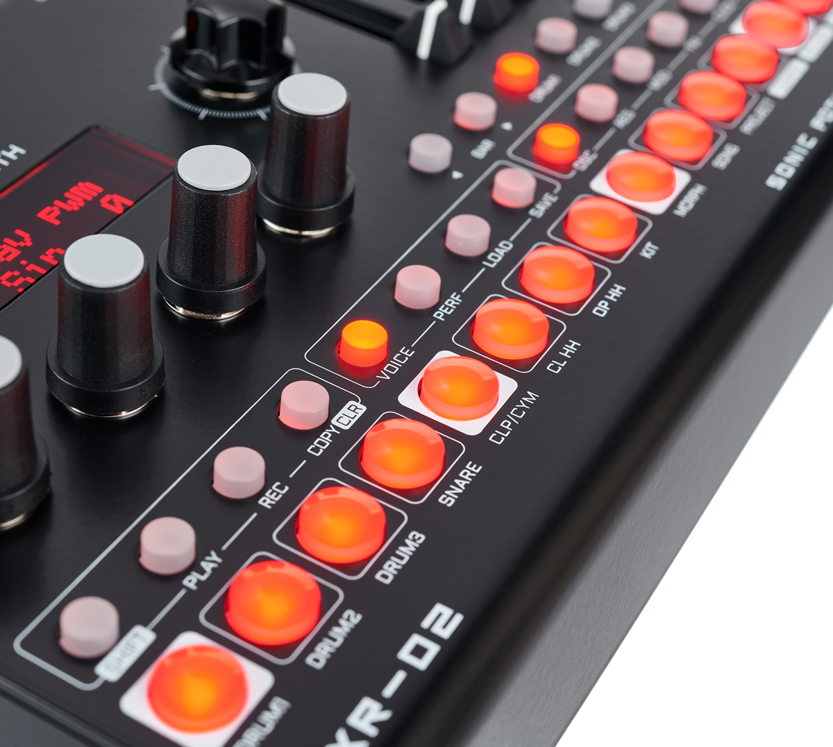 Patterns werden in gewohnter Lauflichtprogrammierung eingegeben und bei aktivem Record Button lassen sich zusätzlich bis zu zwei Automationen in Echtzeit aufnehmen. Trig Probability wird mit dem Tastenkürzel Shift und Voice aktiviert und erlaubt die unabhängige Werteingabe für Pitch, Velocity und Abspielwahrscheinlichkeit. Mittels Shift und Voice-Taster können einzelne Stimmen stummgeschaltet werden. Trotz der geringen Größe der LXR-02 ist bereits beim Muten des Claps oder der Cymbals zweihändige Bedienung gefragt. Das FX-Menü und die anderen, doppelbelegten Step-Taster sind ebenfalls nicht mit nur einer Hand erreichbar.