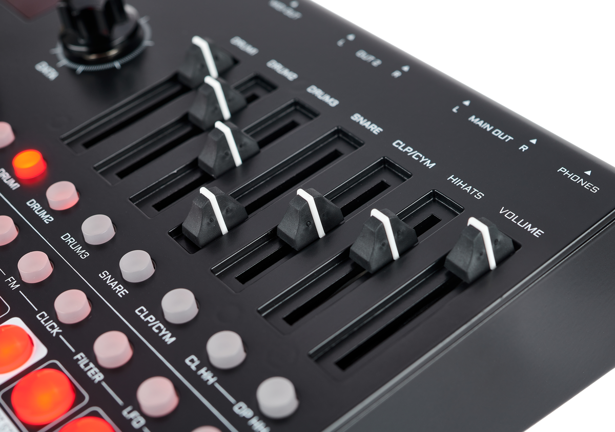 Mit etwas Drumsynth-Erfahrung lassen sich jedenfalls in Windeseile auch zahm-gewöhnliche Trommelklänge programmieren. In Form von Clicks können den Oszillatoren sogar noch kurze Samples beigemischt werden, falls dem Sound doch mal die "weltliche" Komponente fehlt. Die Verteilung der regelbaren Parameter auf die Oszillatoren ist insgesamt in Ordnung, gut kuratiert und sorgt wie gesagt schnell für brauchbare Ergebnisse. Besonders die Hüllkurvensteuerung funktioniert lediglich mit Attack, Decay und Slope effizient und musikalisch. Der fehlende Reverb ist bei den Abschwingverhalten jedenfalls erstaunlich gut zu verkraften.