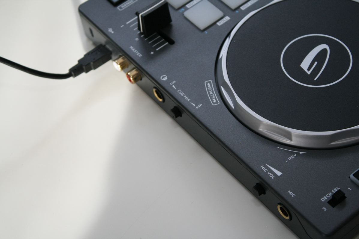Zur Soundausgabe gibt es ein Audiointerface, das mit 24-Bit und 48 kHz arbeitet. Auf einen Soundkarteneingang wurde verzichtet. Die Anschlüsse des Controllers befinden sich alle auf der linken Seite des Gehäuses, statt wie bei den meisten Geräten auf der Rückseite. Zu finden sind hier ein Cinch-Masterausgang, ein Kopfhöreranschluss inklusive Cue-Mix-Regelung und ein Mikrofoneingang. Das am Mikrofoneingang anliegende Signal wird direkt an den Masterausgang geleitet und kann somit nicht mit Softwareeffekten bearbeitet werden. Einen Booth-Ausgang gibt es, wie bei vielen anderen Geräten der Einsteigerklasse, leider nicht.